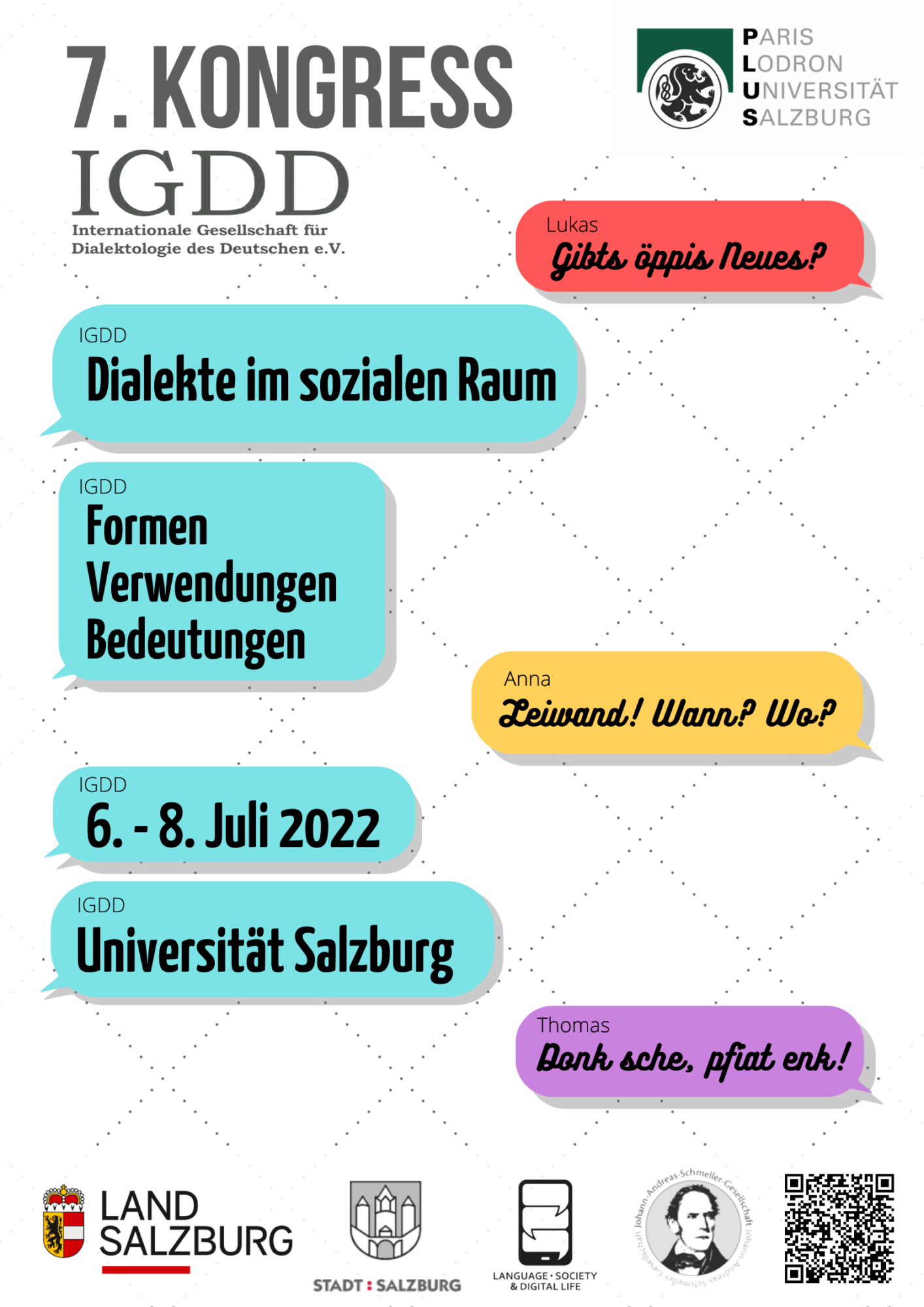 Vom 6. – 8. Juli 2022 fand im Unipark Nonntal der Universität Salzburg der 7. Kongress der Internationalen Gesellschaft für Dialektologie des Deutschen (IGDD) statt. Das Schwerpunktthema lautete: Dialekte im sozialen Raum: Formen – Verwendungen – Bedeutungen. Im Sinne dieses Themas wurden aktuelle Konzepte und Ergebnisse zu Dialekten und andere regionalen Varietäten, die in besonderer Weise den Sprachgebrauch im sozialen Raum thematisieren, vorgestellt und diskutiert. Daneben bot der Kongress auch Raum für Präsentationen zu allen Bereichen der modernen Dialektologie und Variationslinguistik.
