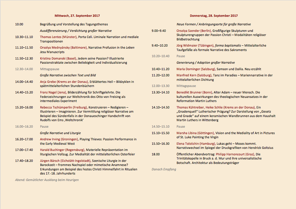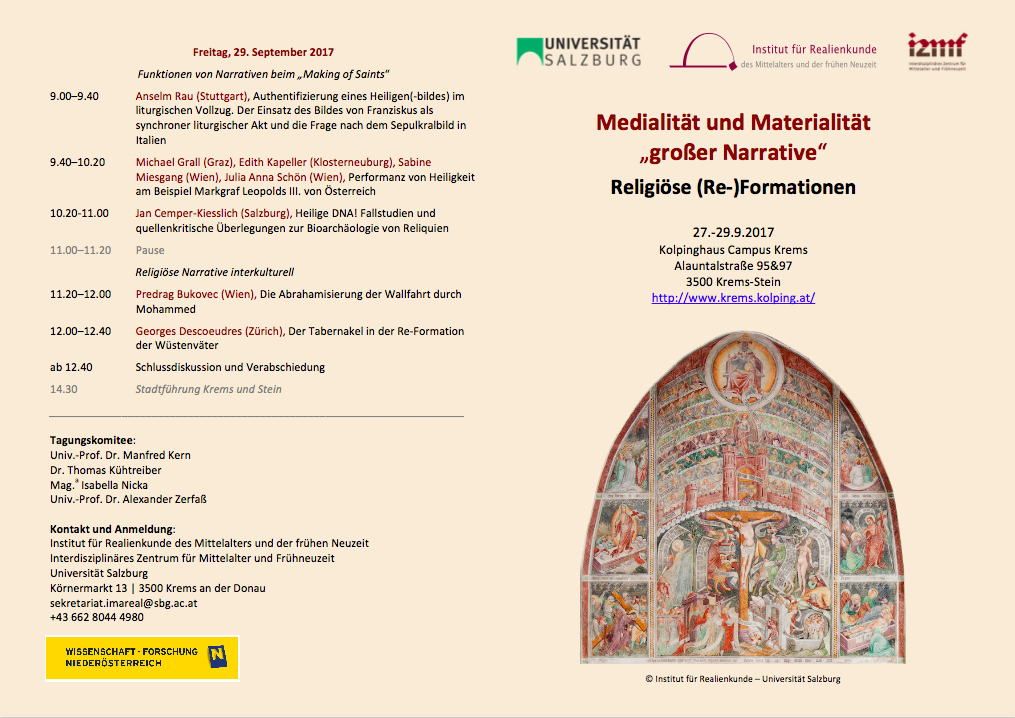 Von 27. bis 29. September 2017 fand in Krems eine internationale Tagung des IZMF/IMAREAL mit dem Titel „Medialität und Materialität ‚großer Narrative‘: Religiöse (Re-)Formationen“ stattfinden. Das Programm der Tagung ist hier abrufbar: