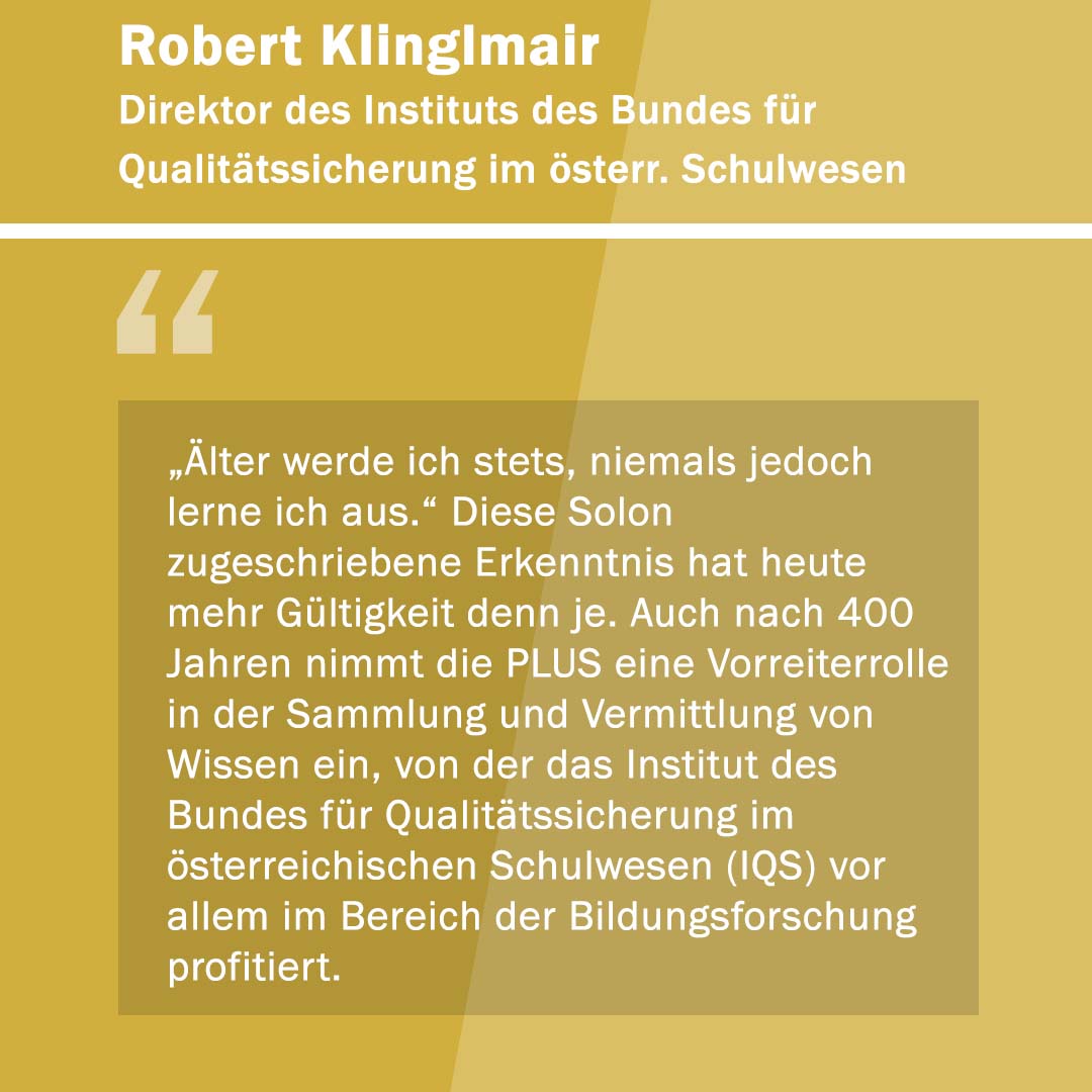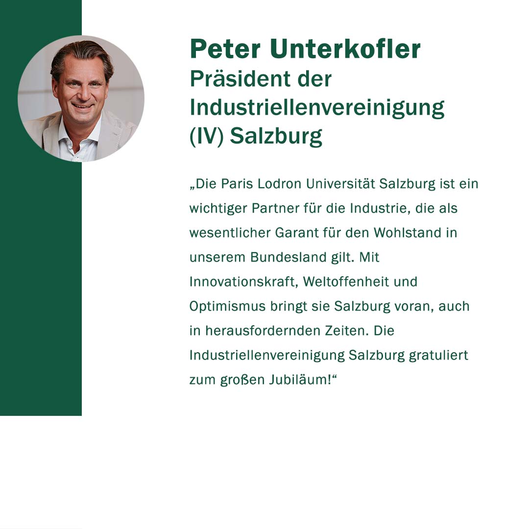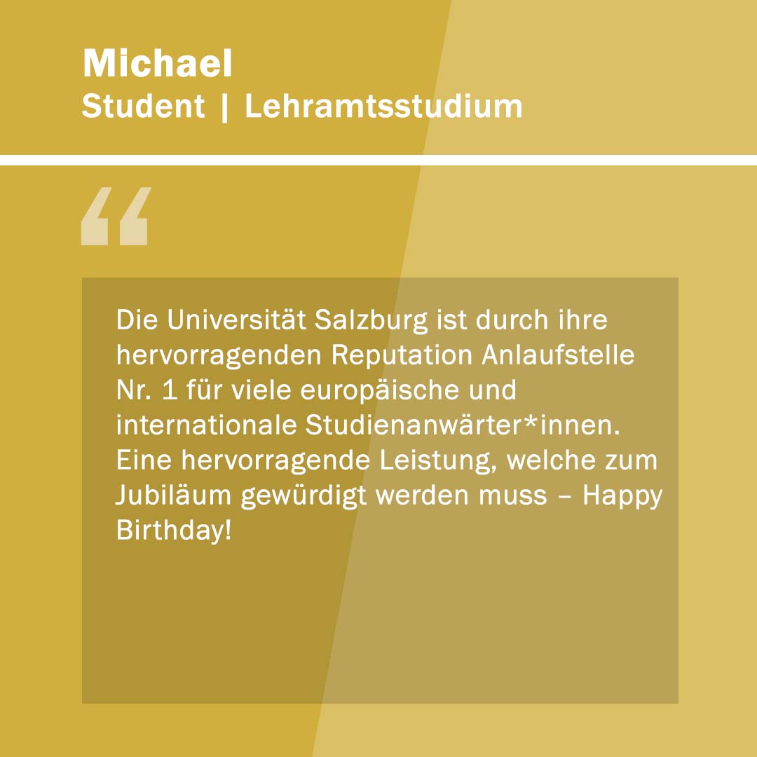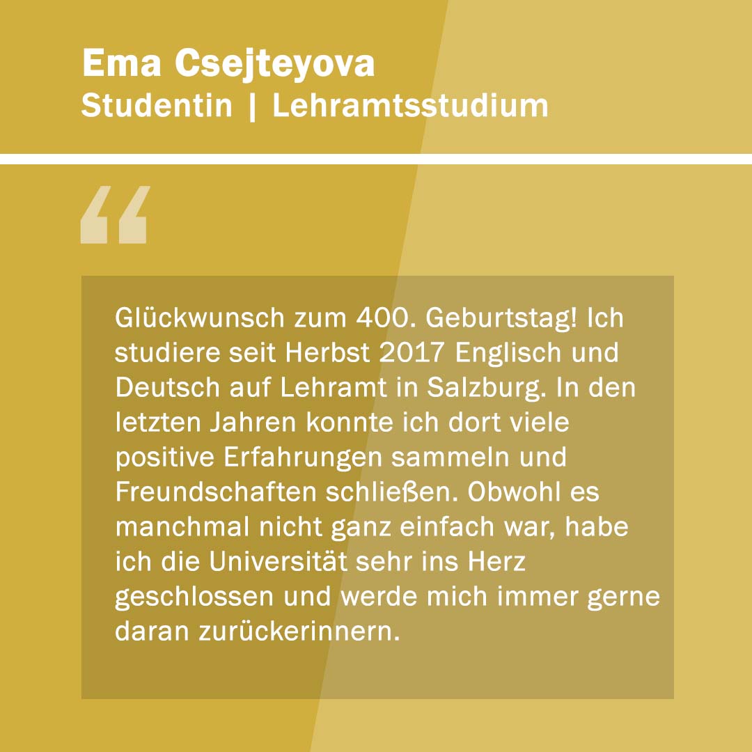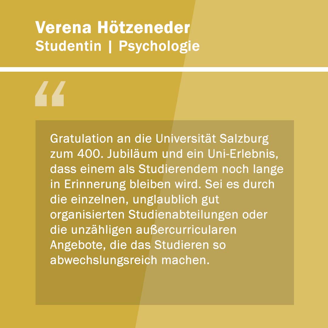 Anlässlich ihres 400. Gründungstages freute sich die Paris Lodron Universität Salzburg über alle Wortspenden zu ihrem Jubiläum! „400 Stimmen zu 400 Jahren“ war eine Initiative, um diese Grußworte und Gratulationen sichtbar zu machen. Der April 2022 hat 30 neue Nachrichten geboten. Jede Grußbotschaft steht für eine Stimme oder auch für die vielen Stimmen einer Einrichtung. Es kamen Studierende zu Wort, Alumni, einzelne Mitarbeiter*innen sowie ganze Organisationseinheiten der PLUS. Aber auch Persönlichkeiten und verschiedene Einrichtungen aus Politik, Wirtschaft und Gesellschaft haben uns wieder ihre Stimmen zugesandt. Die Nachrichten sind so vielfältig wie ihre Absender*innen.