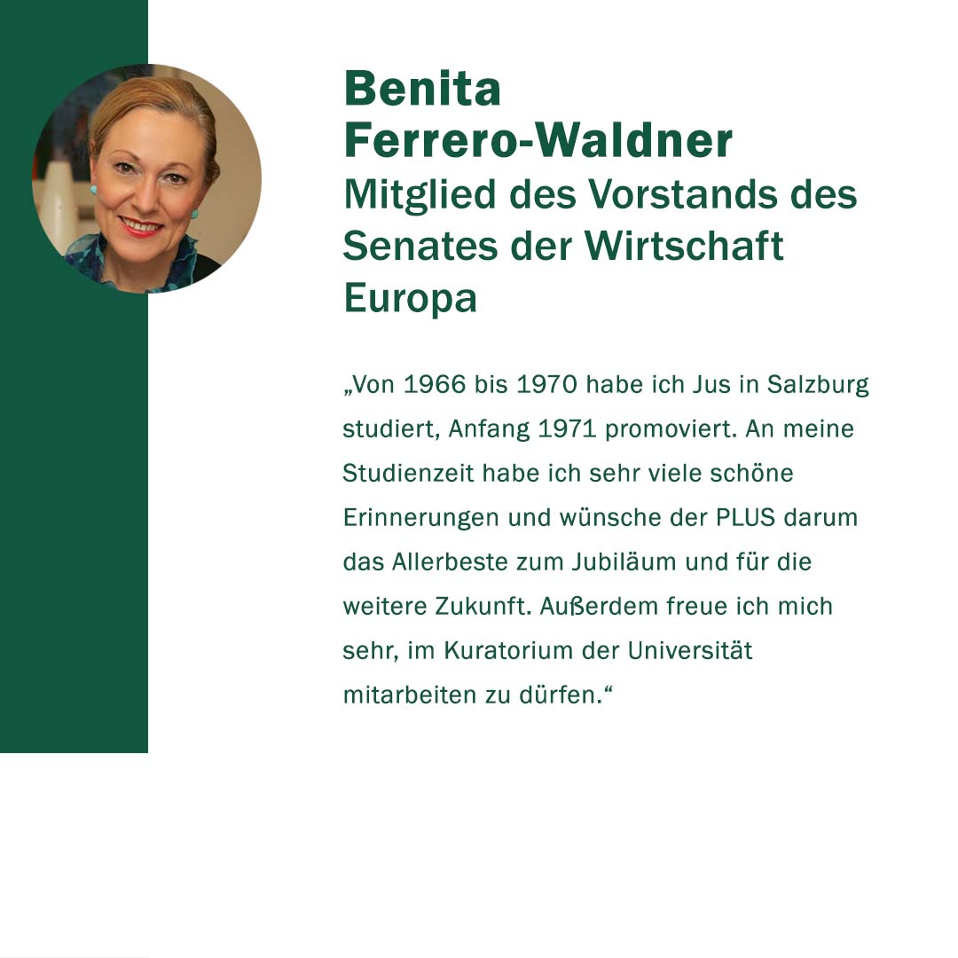 - Hier finden Sie die vollständige Grußbotschaft von Benita Ferrero-Waldner, Mitglied des Vorstands des Senates der Europäischen Wirtschaft. Sie ist zudem Mitglied des Kuratoriums der Paris Lodron Universität Salzburg.