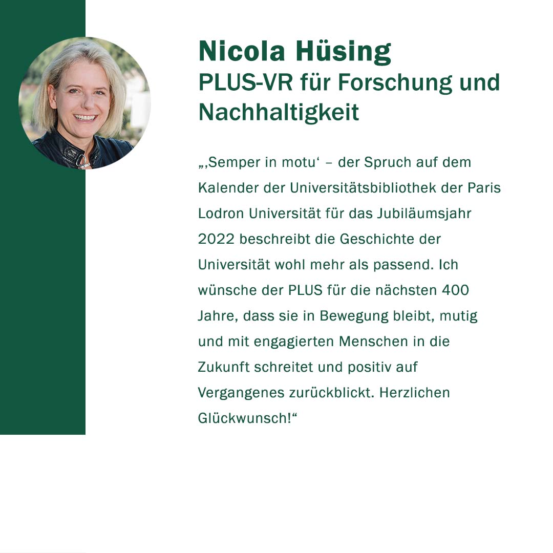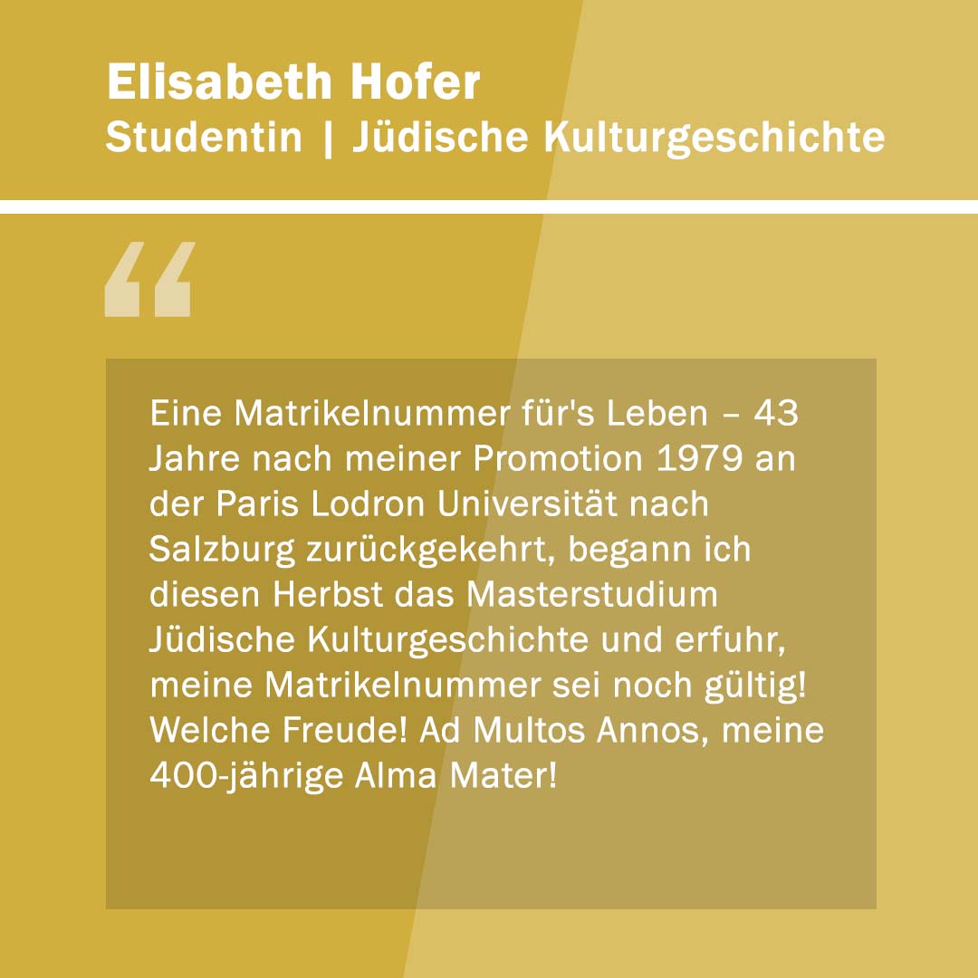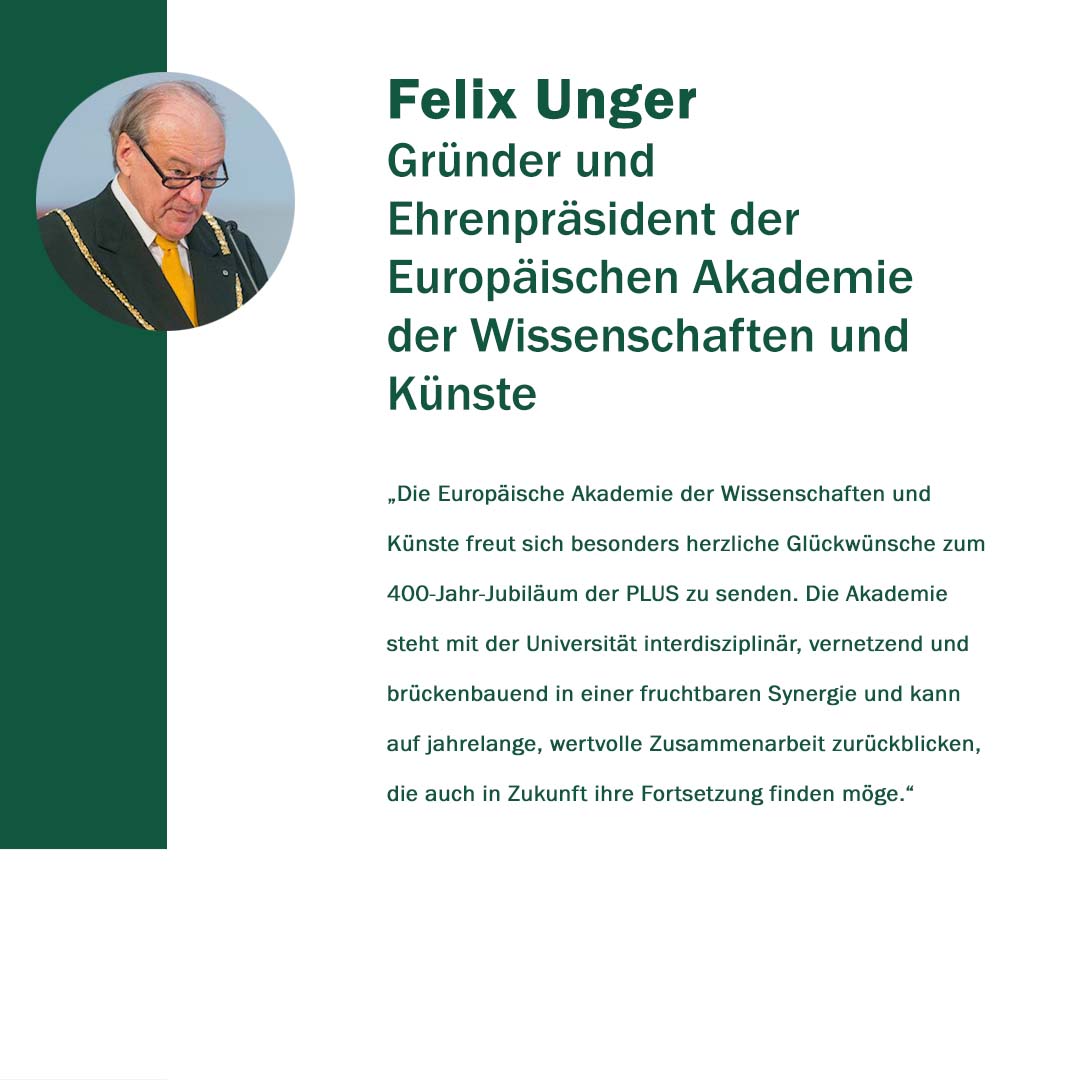 Anlässlich ihres 400. Gründungstages freute sich die Paris Lodron Universität Salzburg über alle Wortspenden zu ihrem Jubiläum! „400 Stimmen zu 400 Jahren“ war eine Initiative, um diese Grußworte und Gratulationen sichtbar zu machen. Wir starteten in Jänner 2022 mit 37 Grußbotschaften – bunt gemischt von Studierenden, bekannten Persönlichkeiten unter anderem aus Kultur, Politik und Wirtschaft, von Alumni sowie Mitarbeiter*innen der PLUS. Die Nachrichten waren so divers wie ihre Absender*innen. Jede Grußbotschaft steht für eine Stimme oder auch für die vielen Stimmen einer Einrichtung.