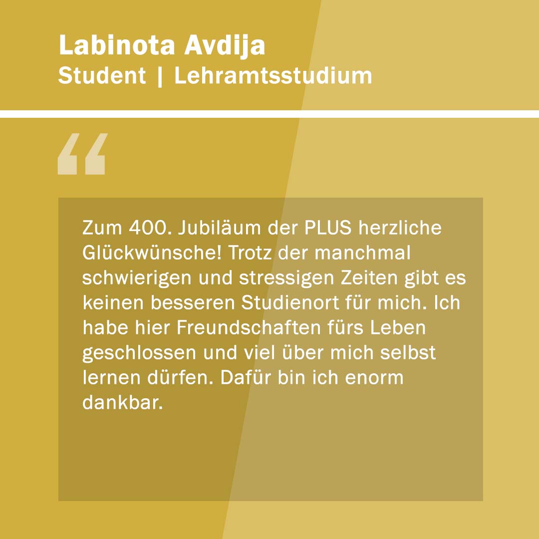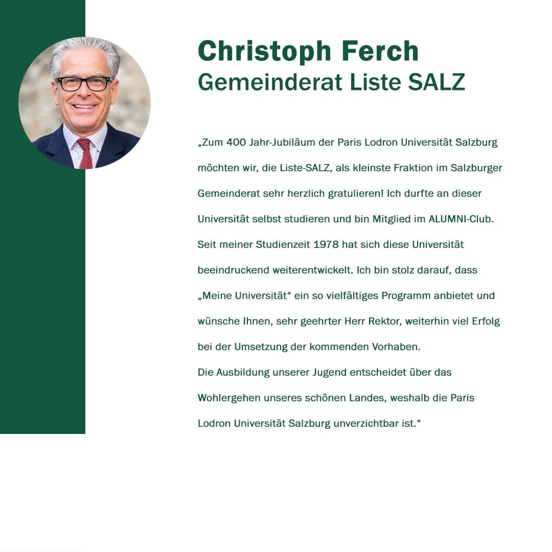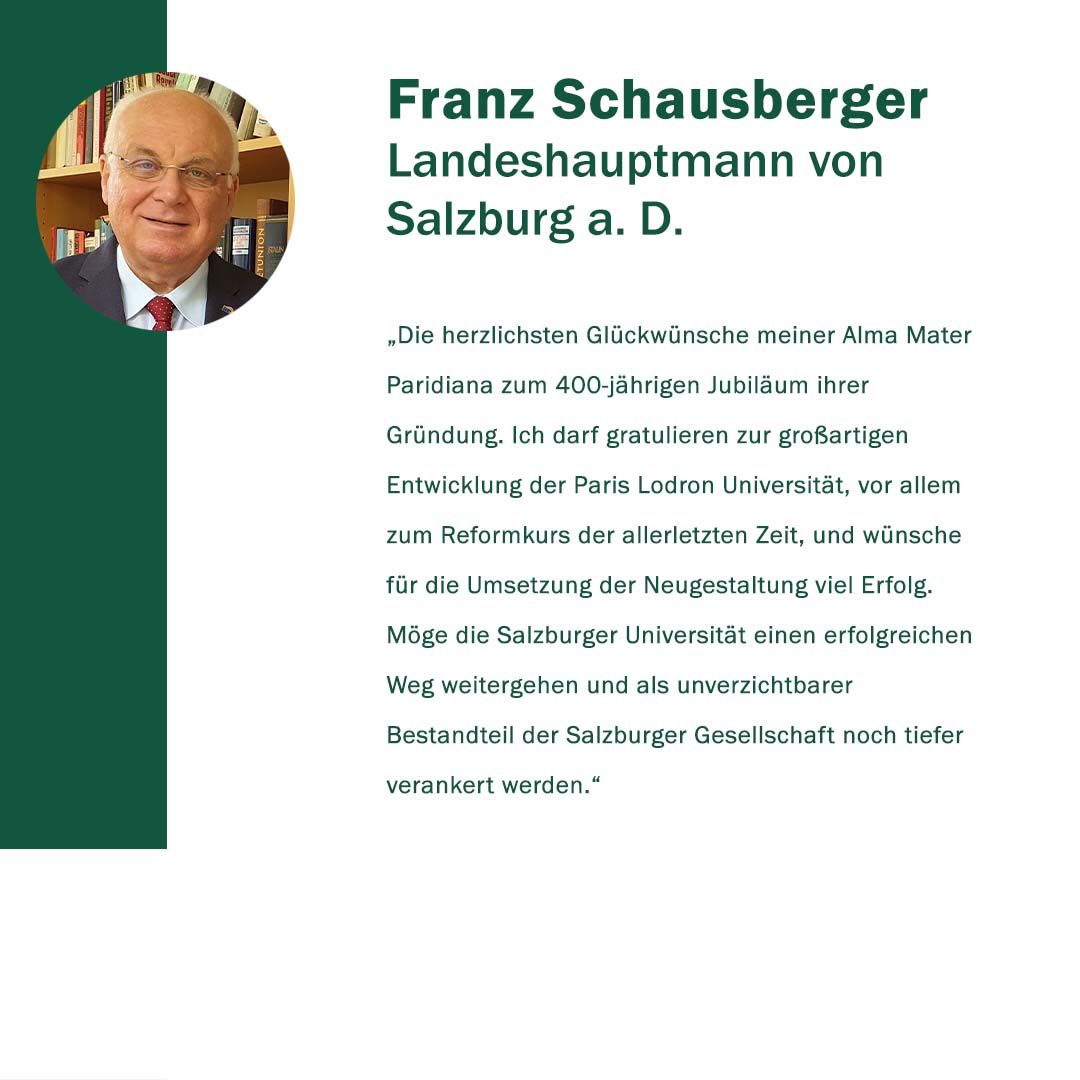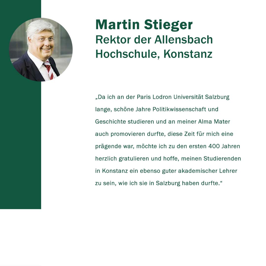 Anlässlich ihres 400. Gründungstages freute sich die Paris Lodron Universität Salzburg über alle Wortspenden zu ihrem Jubiläum! „400 Stimmen zu 400 Jahren“ war eine Initiative, um diese Grußworte und Gratulationen sichtbar zu machen. Im Juni 2022 kamen 30 neue Grußbotschaften hinzu. Jede Grußbotschaft steht für eine Stimme oder auch für die vielen Stimmen einer Einrichtung. Es kamen Studierende zu Wort, Alumni, einzelne Mitarbeiter*innen sowie ganze Organisationseinheiten der PLUS. Aber auch Persönlichkeiten und verschiedene Einrichtungen aus Politik, Wirtschaft und Gesellschaft haben uns wieder ihre Stimmen zugesandt. Die Nachrichten waren so vielfältig wie ihre Absender*innen.
