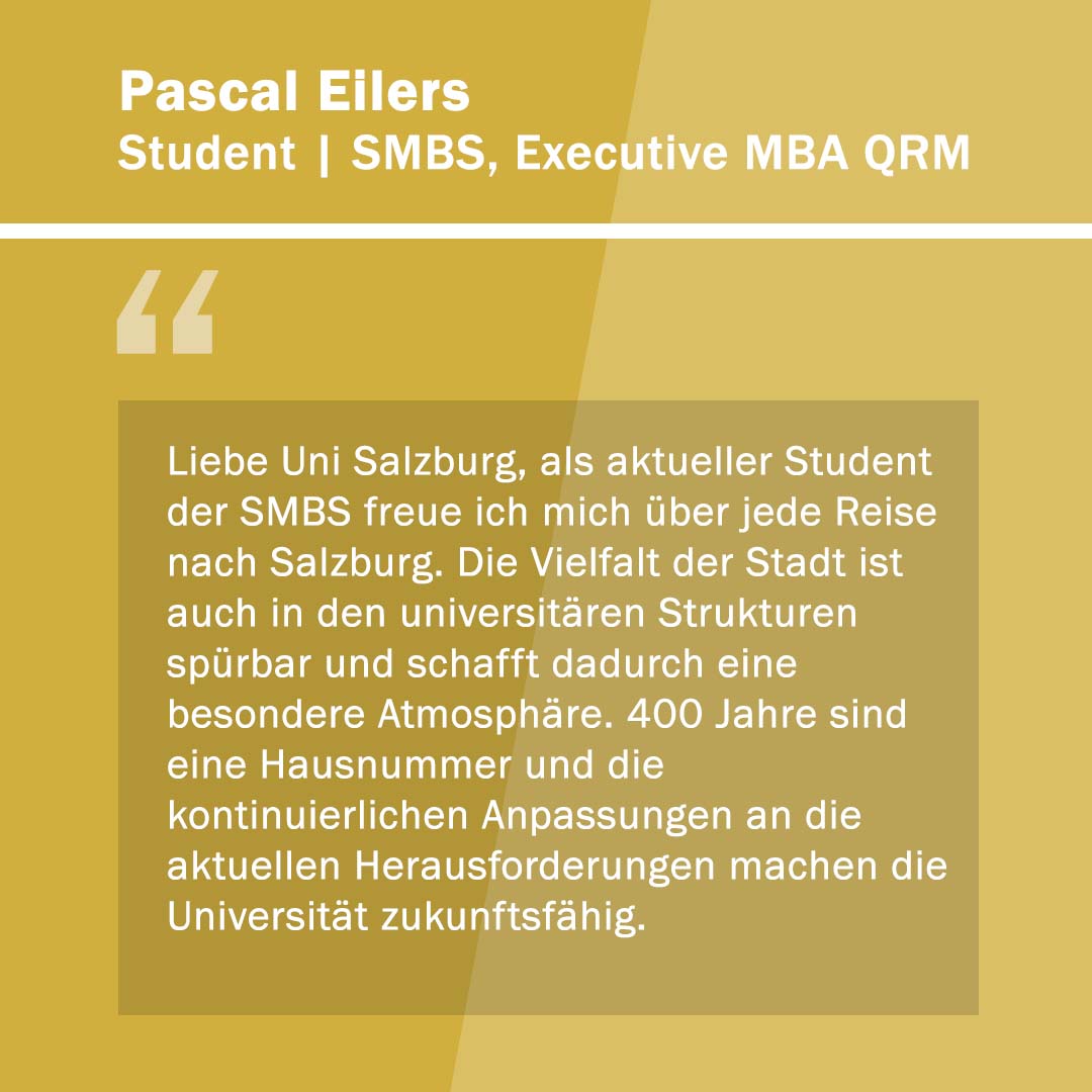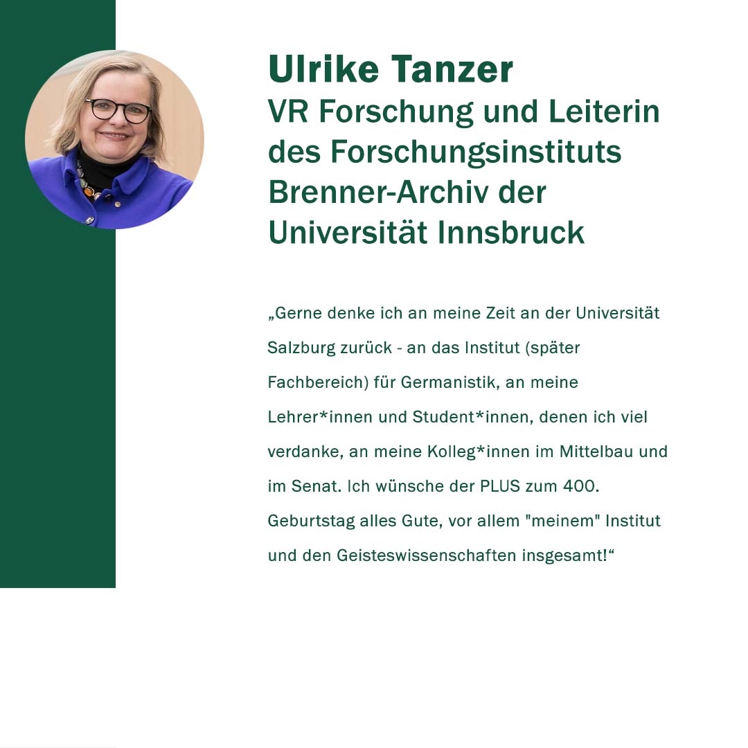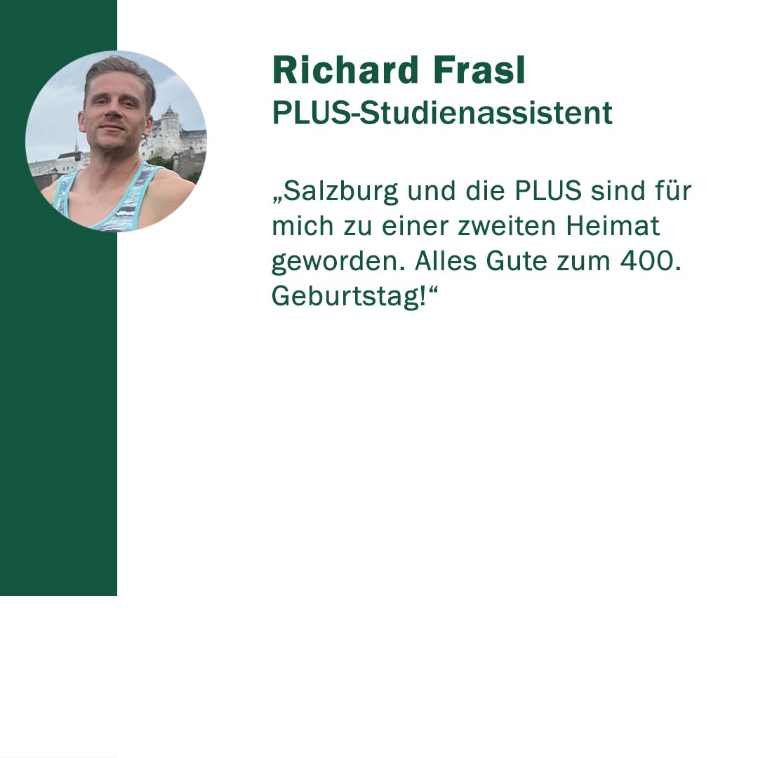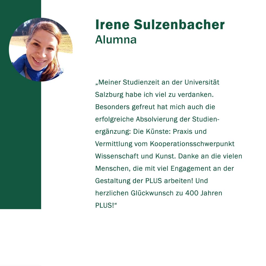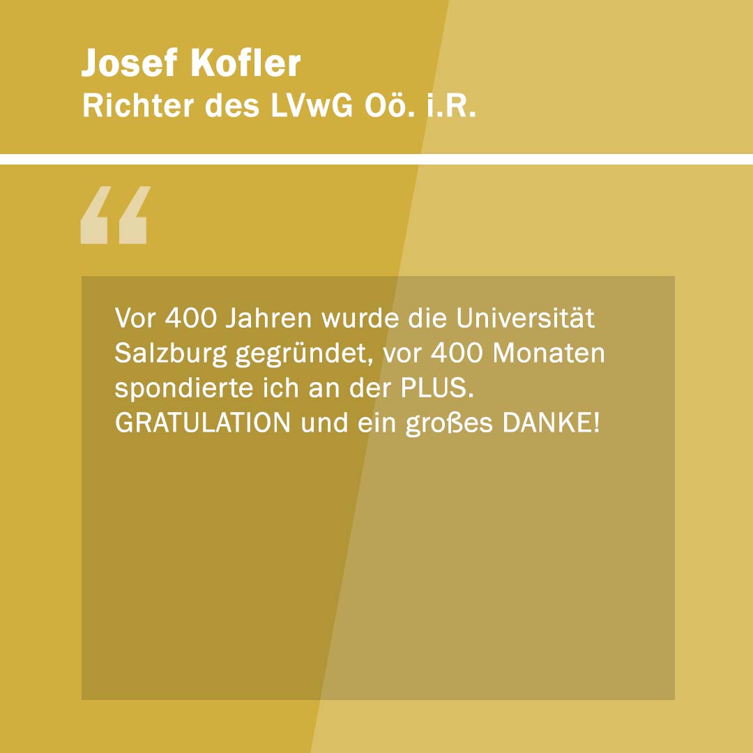 Anlässlich ihres 400. Gründungstages freute sich die Paris Lodron Universität Salzburg über alle Wortspenden zu ihrem Jubiläum! „400 Stimmen zu 400 Jahren“ war eine Initiative, um diese Grußworte und Gratulationen sichtbar zu machen. Im Juni 2022 kamen 30 neue Grußbotschaften hinzu. Jede Grußbotschaft steht für eine Stimme oder auch für die vielen Stimmen einer Einrichtung. Es kamen Studierende zu Wort, Alumni, einzelne Mitarbeiter*innen sowie ganze Organisationseinheiten der PLUS. Aber auch Persönlichkeiten und verschiedene Einrichtungen aus Politik, Wirtschaft und Gesellschaft haben uns wieder ihre Stimmen zugesandt. Die Nachrichten waren so vielfältig wie ihre Absender*innen.
