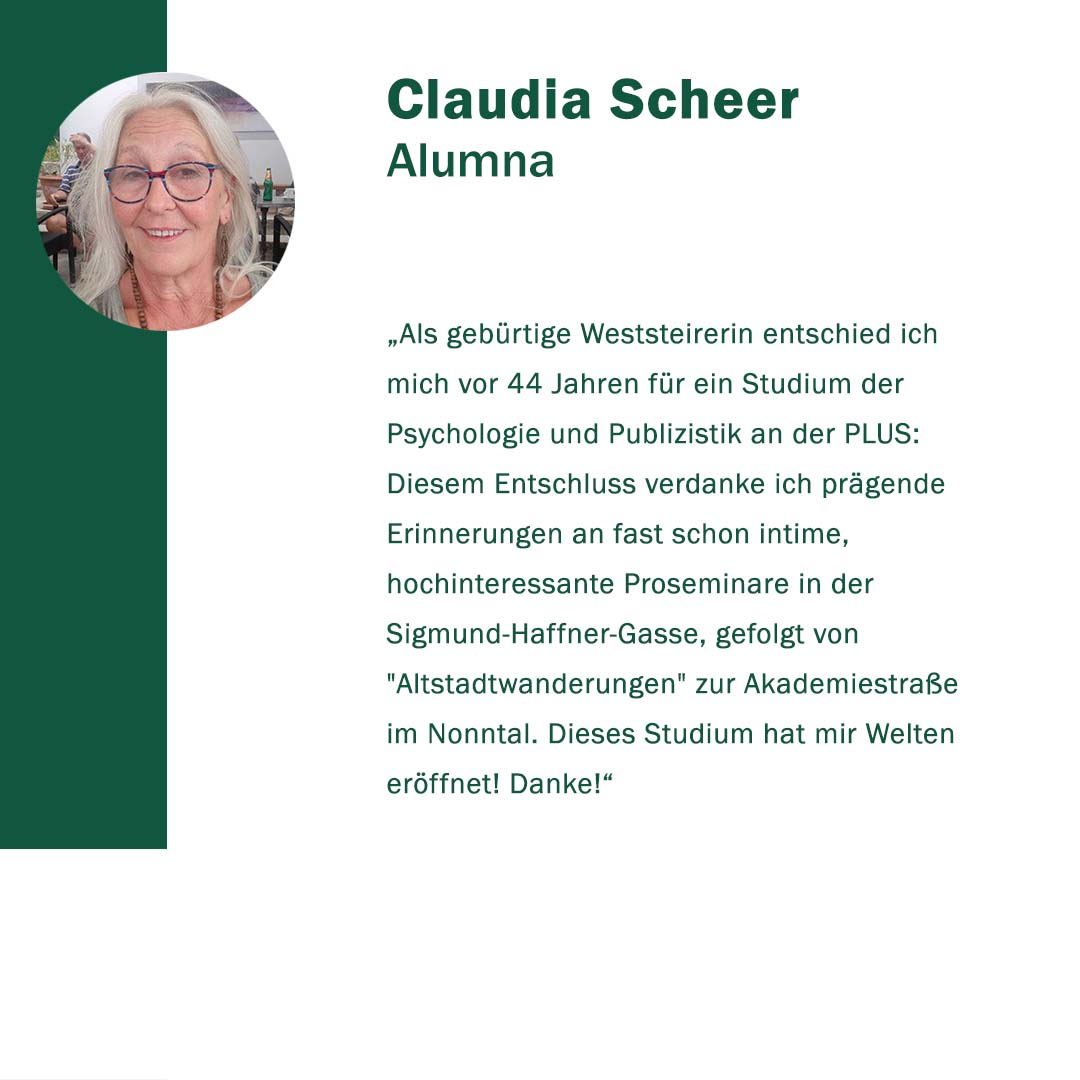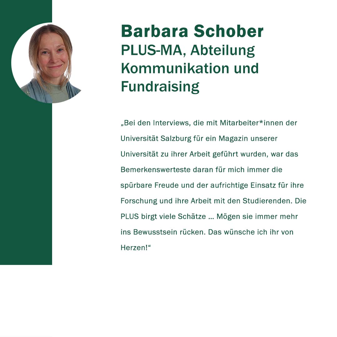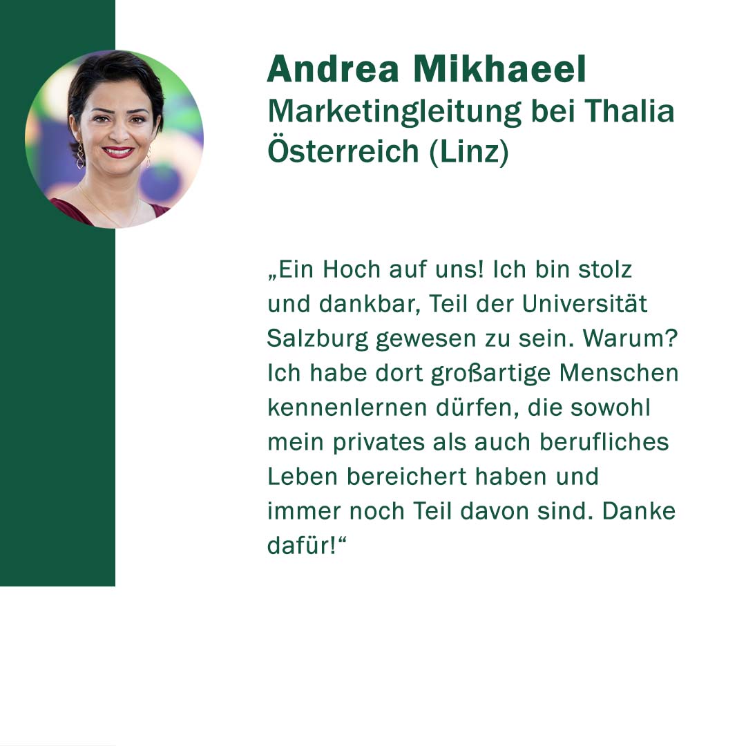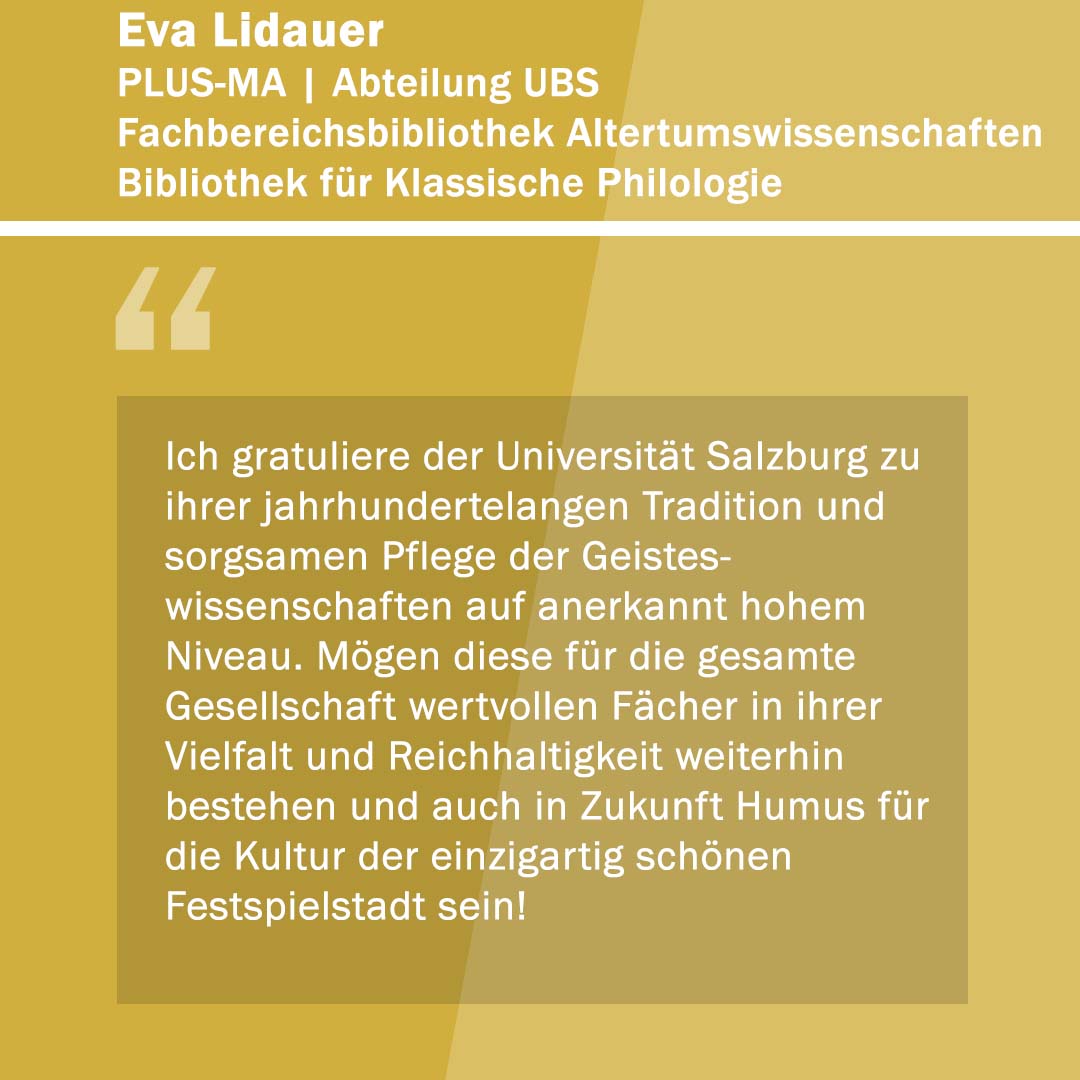 Anlässlich ihres 400. Gründungstages freute sich die Paris Lodron Universität Salzburg über alle Wortspenden zu ihrem Jubiläum! „400 Stimmen zu 400 Jahren“ war eine Initiative, um diese Grußworte und Gratulationen sichtbar zu machen. Im Juni 2022 kamen 30 neue Grußbotschaften hinzu. Jede Grußbotschaft steht für eine Stimme oder auch für die vielen Stimmen einer Einrichtung. Es kamen Studierende zu Wort, Alumni, einzelne Mitarbeiter*innen sowie ganze Organisationseinheiten der PLUS. Aber auch Persönlichkeiten und verschiedene Einrichtungen aus Politik, Wirtschaft und Gesellschaft haben uns wieder ihre Stimmen zugesandt. Die Nachrichten waren so vielfältig wie ihre Absender*innen.