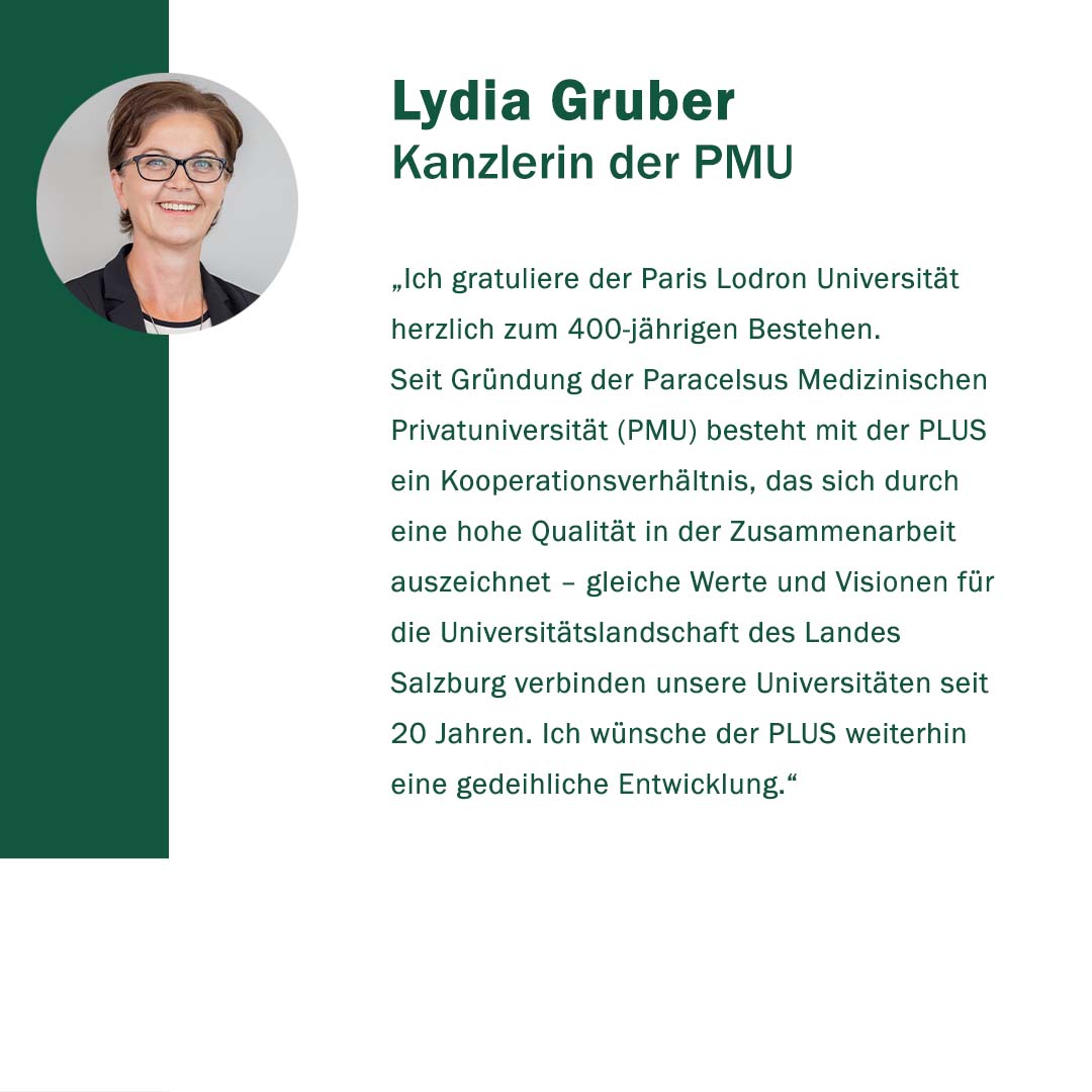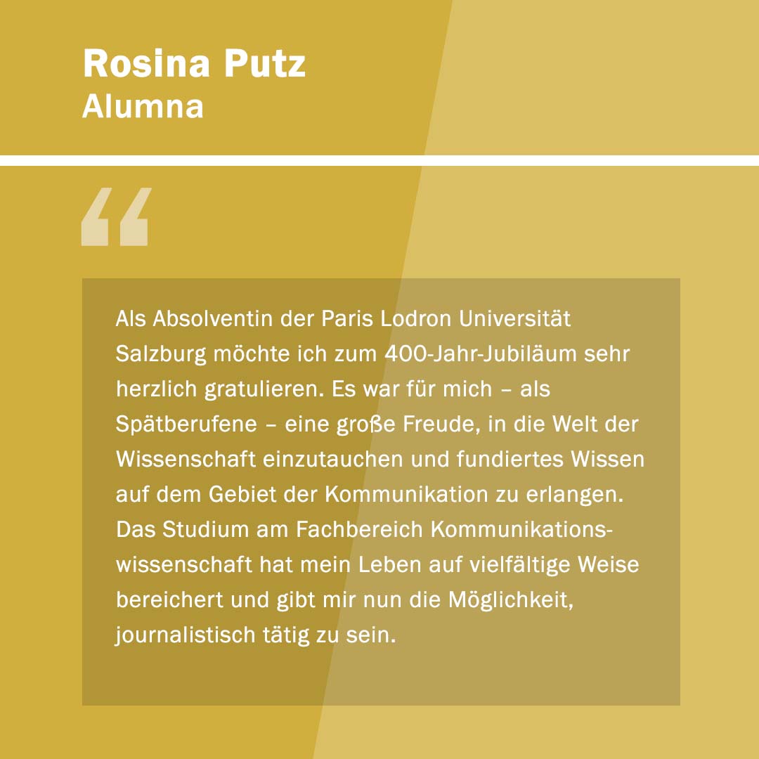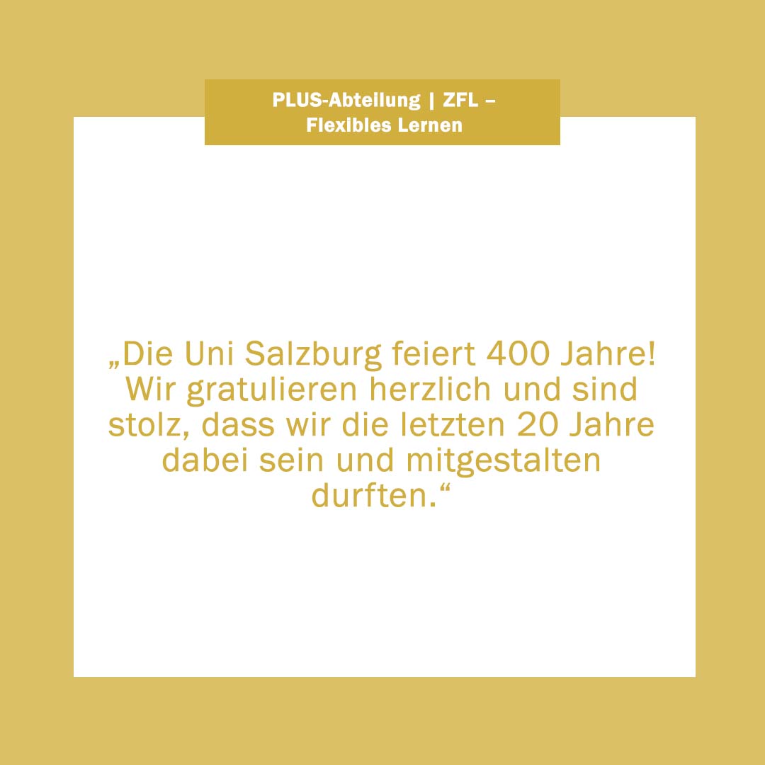 Anlässlich ihres 400. Gründungstages freute sich die Paris Lodron Universität Salzburg über alle Wortspenden zu ihrem Jubiläum! „400 Stimmen zu 400 Jahren“ war eine Initiative, um diese Grußworte und Gratulationen sichtbar zu machen. Im Mai 2022 kamen 30 neue Grußbotschaften hinzu. Jede Grußbotschaft steht für eine Stimme oder auch für die vielen Stimmen einer Einrichtung. Es kamen Studierende zu Wort, Alumni, einzelne Mitarbeiter*innen sowie ganze Organisationseinheiten der PLUS. Aber auch Persönlichkeiten und verschiedene Einrichtungen aus Politik, Wirtschaft und Gesellschaft haben uns wieder ihre Stimmen zugesandt. Die Nachrichten sind so vielfältig wie ihre Absender*innen.