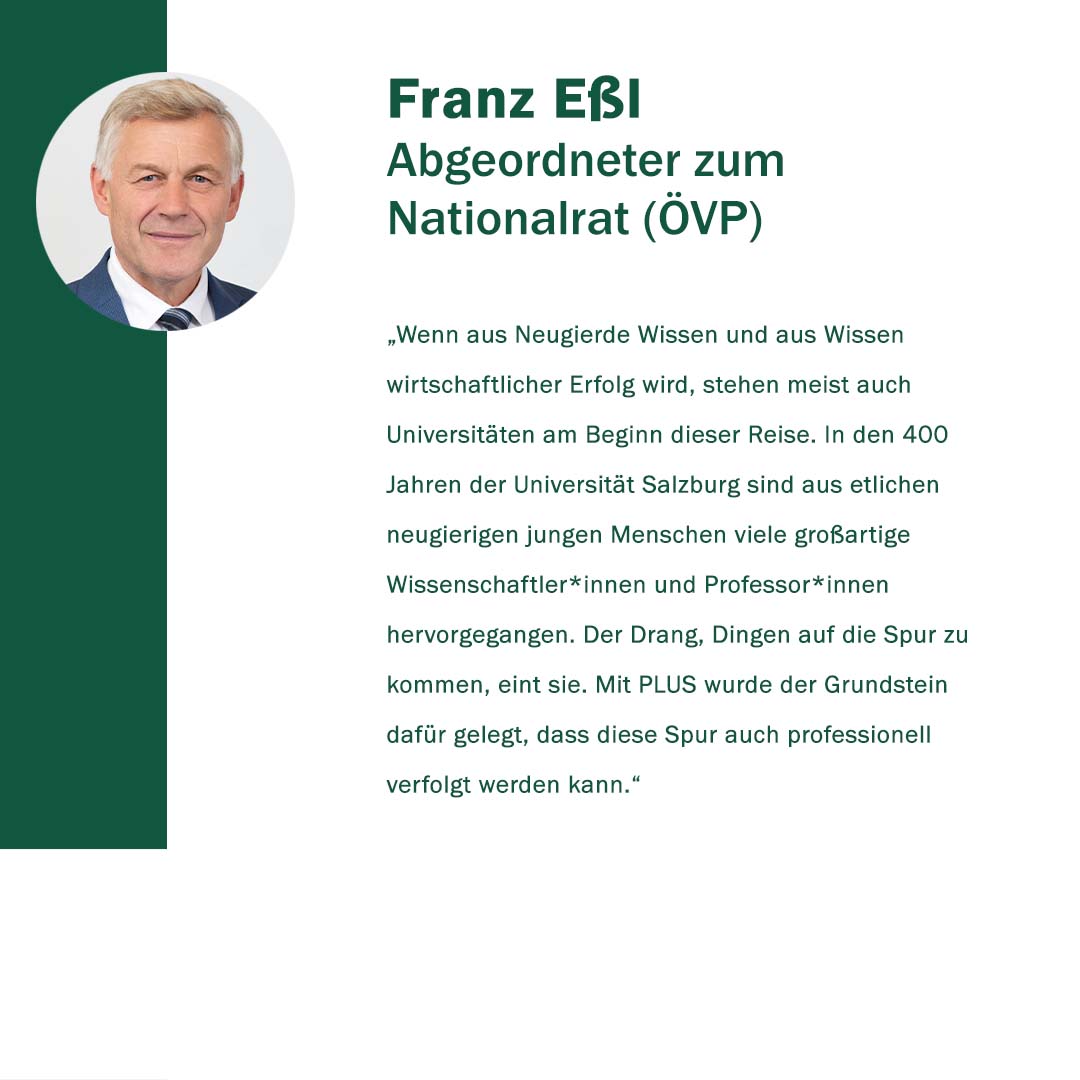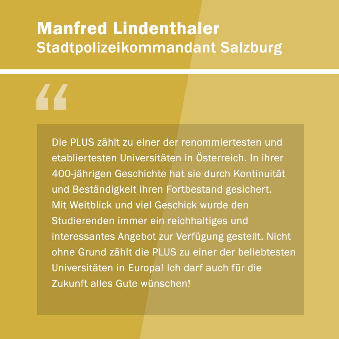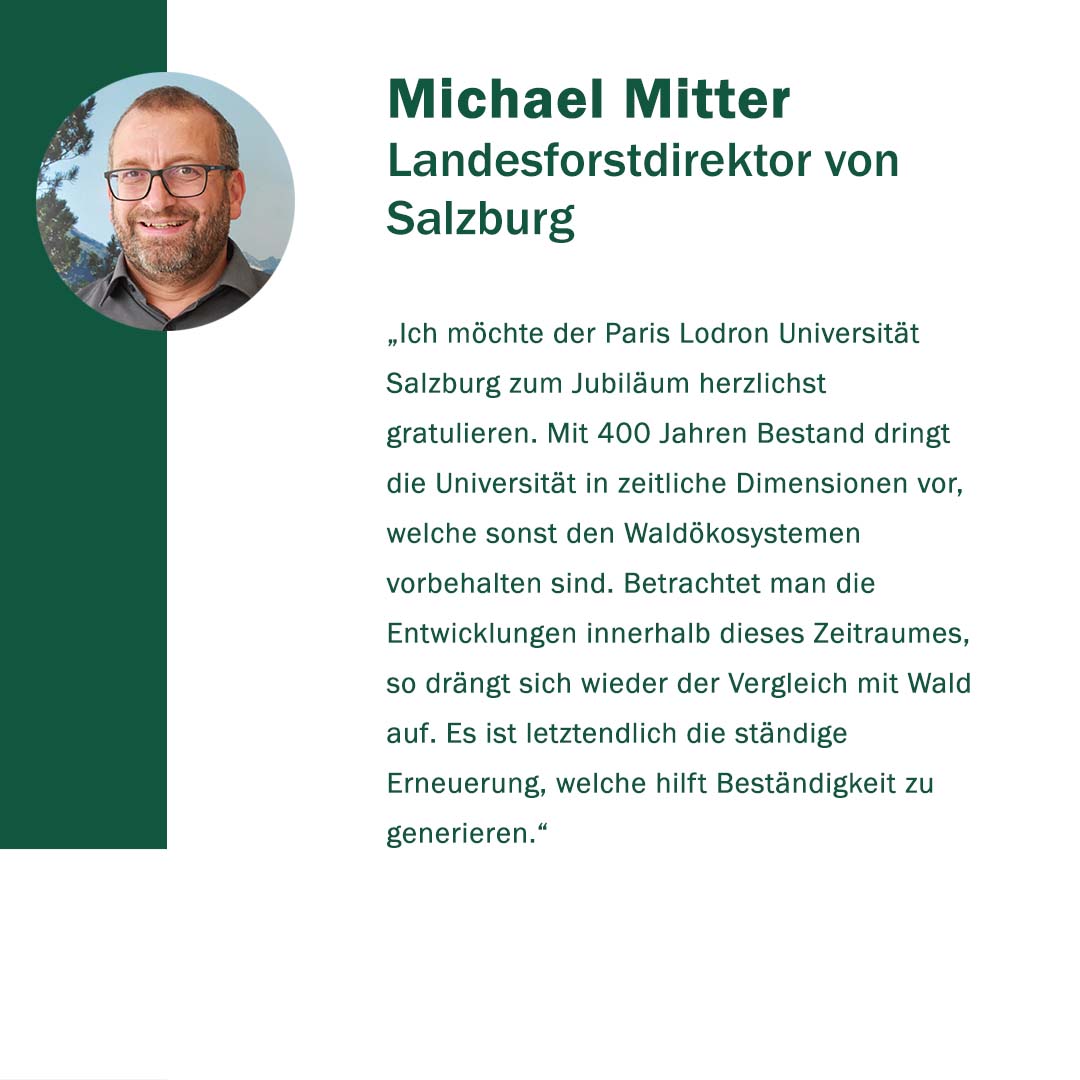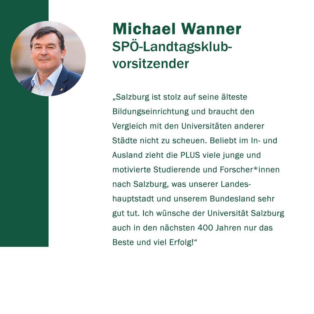 Anlässlich ihres 400. Gründungstages freute sich die Paris Lodron Universität Salzburg über alle Wortspenden zu ihrem Jubiläum! „400 Stimmen zu 400 Jahren“ war eine Initiative, um diese Grußworte und Gratulationen sichtbar zu machen. Im Mai 2022 kamen 30 neue Grußbotschaften hinzu. Jede Grußbotschaft steht für eine Stimme oder auch für die vielen Stimmen einer Einrichtung. Es kamen Studierende zu Wort, Alumni, einzelne Mitarbeiter*innen sowie ganze Organisationseinheiten der PLUS. Aber auch Persönlichkeiten und verschiedene Einrichtungen aus Politik, Wirtschaft und Gesellschaft haben uns wieder ihre Stimmen zugesandt. Die Nachrichten sind so vielfältig wie ihre Absender*innen.