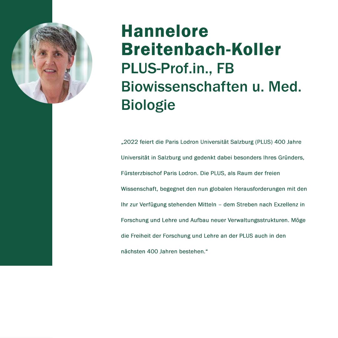 - Hier finden Sie die lange Grußbotschaft von Hannelore Breitenbach-Koller, PLUS-Professorin am Fachbereich Biowissenschaften und Medizinische Biologie.