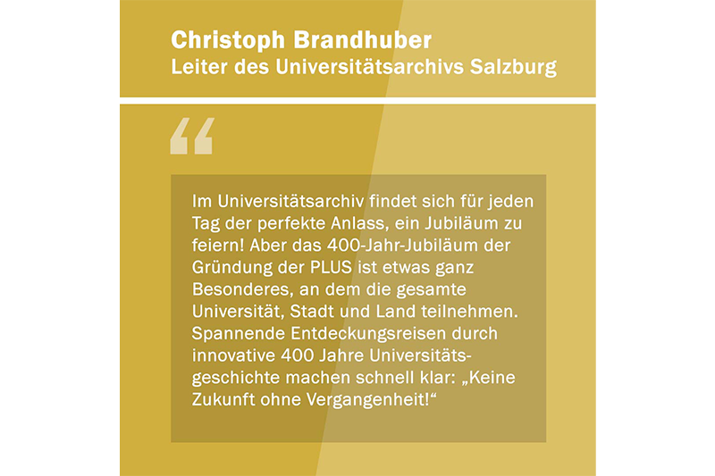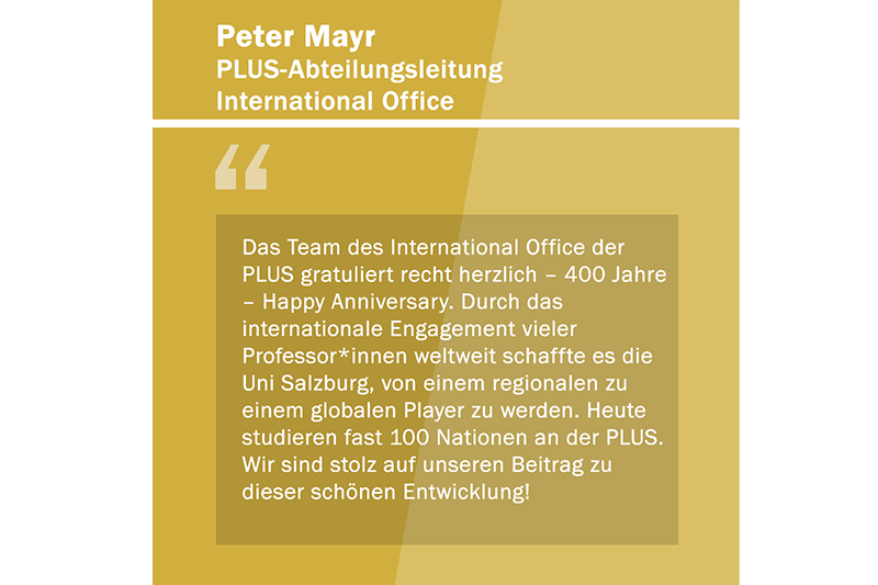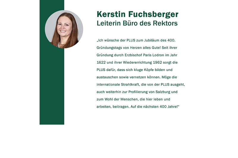 Anlässlich ihres 400. Gründungstages am 4. Oktober 1622 freute sich die Paris Lodron Universität Salzburg über alle Wortspenden zu ihrem Jubiläum! „400 Stimmen zu 400 Jahren“ war eine Initiative, um diese Grußworte und Gratulationen sichtbar zu machen. Im Oktober 2022 kamen wieder einige schöne neue Grußbotschaften hinzu. In diesem Monat kamen einzelne Mitarbeiter*innen sowie ganze Organisationseinheiten der PLUS zu Wort. Jede Grußbotschaft steht wieder für eine Stimme oder auch für die vielen Stimmen einer Einrichtung. Damit endete dieses facettenreiche Projekt.