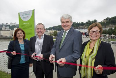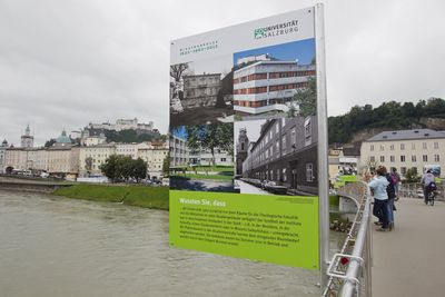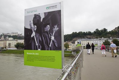 Vizerektorin Sylvia Hahn wies darauf hin, dass es zusätzlich zur Ausstellung „Wissensbrücke“ am Makartsteg auch den von der Universitätsbibliothek gestalteten Jubiläumspfad, mit vielen interessanten Informationen zur Geschichte der Universität, in der Hofstallgasse zu sehen gab: http://www.ubs.sbg.ac.at/uniarchiv/jubilaeumspfad3.pdf