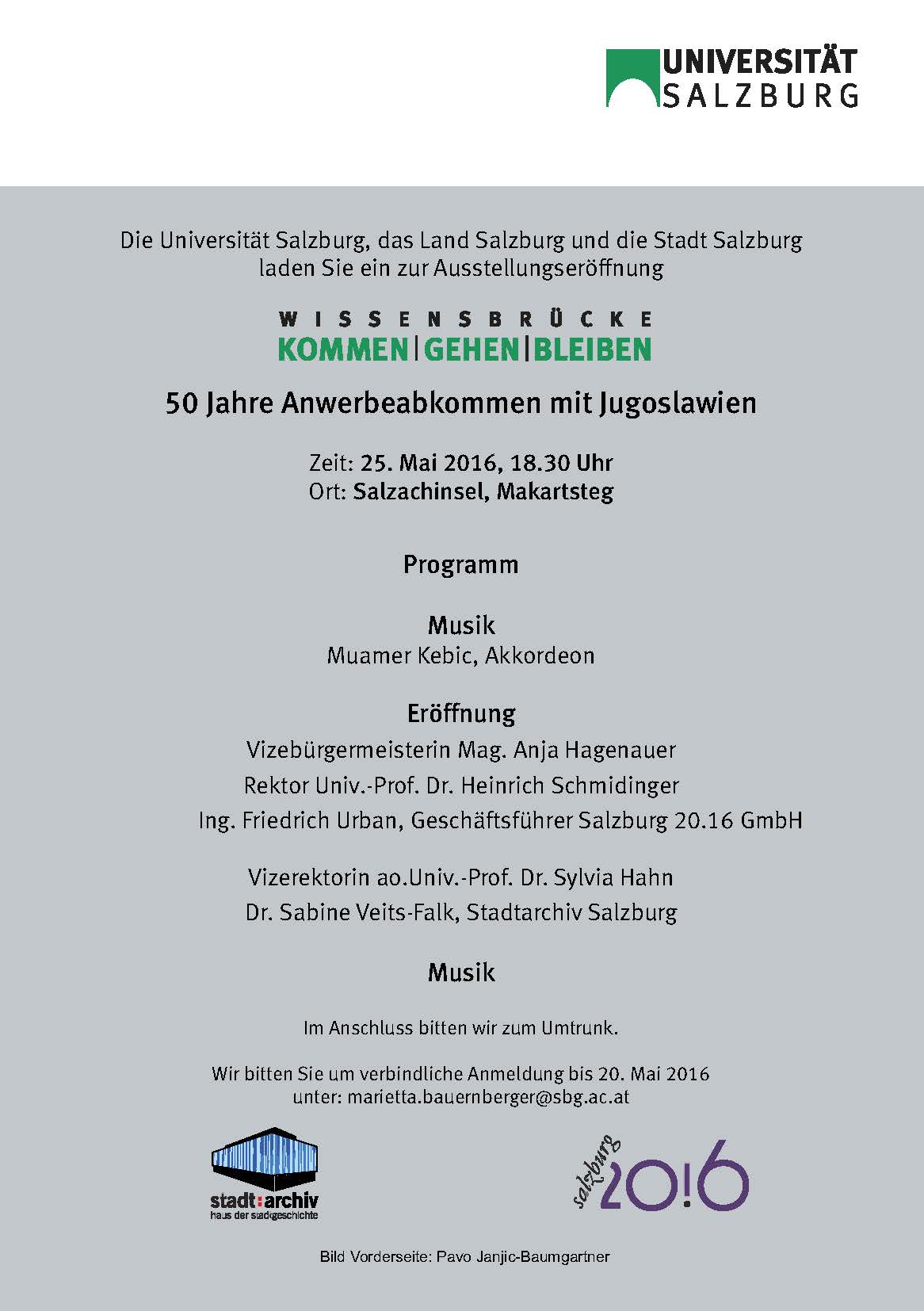 Im Jahr 1966 schloss Österreich ein Anwerbeabkommen mit Jugoslawien. Auf diese Weise kamen zahlreiche ArbeitsmigrantInnen nach Salzburg. Viele von ihnen blieben hier und gründeten Familien, weitere Frauen und Männer folgten. Druch die Migrationen entstanden enge Verbindungen zwischen den Staaten und grenzüberschreitende Netzwerke. Die diesjährige Ausstellung der Wissensbrücke auf dem Makartsteg, gestaltet von der Universität und dem Stadtarchiv Salzburg, widmet sich der Geschichte dieser MigrantInnen von 1960 bis 1980. Neben offiziellen Dokumenten illustrieren private Fotos das Erwerbs- und Alltagsleben der MigrantInnen und ihrer Kinder, deren Freizeitaktivitäten und berufliche Erfolge.
