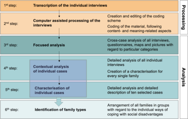 Im Mittelpunkt der Erhebungsmethoden stehen qualitative Leitfadeninterviews mit je einem Elternteil und einem Kind der Familie. Die Interviews werden jeweils parallel in unterschiedlichen Räumen in der Wohnung der Familie durchgeführt, um gegenseitige Einflussnahmen auszuschließen. Darüber hinaus werden die Jungen jeweils von männlichen, die Mädchen von weiblichen Personen interviewt. Ergänzend zu den Leitfadeninterviews kommen standardisierte Fragebögen zum Einsatz, in denen z.B. das Einkommen, die Anzahl der Personen im Haushalt, der Bildungsgrad und die Wohnsituation abgefragt werden, um diese Daten über die Zeit möglichst einfach vergleichbar zu halten. Nach den Interviews halten die Interviewer darüber hinaus ihre Beobachtungen zum Familienklima, der Ausstattung der Wohnung und weitere Eindrücke in Beobachtungsprotokollen fest. Seit der fünften Erhebungswelle werden die Heranwachsenden zudem gebeten, Mindmaps zur ihren Beziehungsstrukturen und ihrer Mediennutzung zu zeichnen, Fotos ihres jeweils präferierten Ortes für Hausaufgaben und Mediennutzung sowie ihres Lieblingsplatzes zu erstellen und im Rahmen von lautem Denken ihr Profil im von ihnen bevorzugten Social Media-Angebot vorzustellen. Die Auswertung erfolgt in mehreren Phasen und Teilschritten; siehe dazu Abbildung „Auswertungsschritte“ und folgenden Link: Vortrag Auswertungsstrategien einer Langzeitstudie.