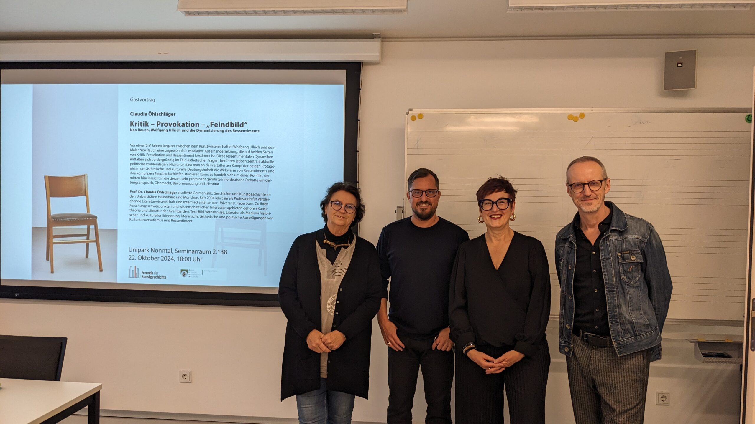 In trauter Gemeinsamkeit luden der Verein der Freunde der Kunstgeschichte und die Abteilung Kunstgeschichte am 22. Oktober zum ersten Gastvortrag in diesem Semester ein: Claudia Öhlschläger von der Uni Paderborn sprach über den öffentlich ausgetragenen Streit zwischen dem Künstler Neo Rauch und dem Kunstkritiker Wolfgang Ullrich. Dabei wurden nicht nur die ‚Frontlinien‘ deutlich, sondern auch, welche grundlegenderen Konflikte und Strategien den Disput kennzeichneten. Vielen Dank für einen ebenso lehrreichen wie unterhaltsamen Abend.