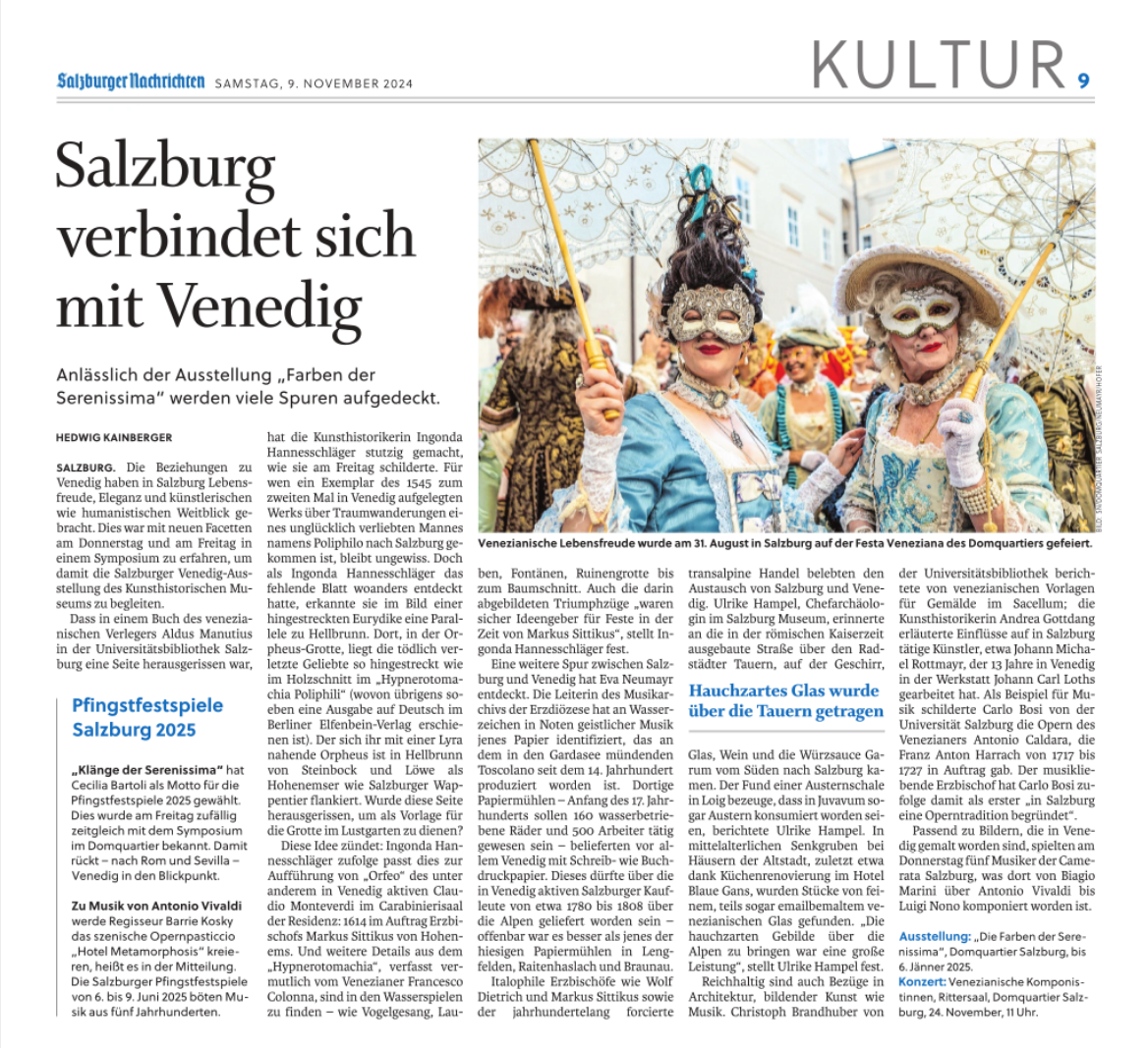 Vergangene Woche fand im DomQuartier Salzburg eine Tagung unter dem Titel „Erzbischof und Doge. Vielfältige Beziehungen zwischen Salzburg und Venedig zur Zeit der Fürsterzbischöfe“ statt, wie u.a. auch die Salzburger Nachrichten (siehe oben) berichten. Der Fachbereich Kunst-, Musik- und Tanzwissenschaft und vor allem die Abteilung Kunstgeschichte war in großer Zahl bei der Organisation und im Programm vertreten. Neben Andrea Gottdang, ehemalige Professorin unseres Instituts, sprachen Ingonda Hannesschläger und Carlo Bosi sowie viele Kolleg·innen der Salzburger Museen, die eng mit der Abteilung Kunstgeschichte verbunden sind.