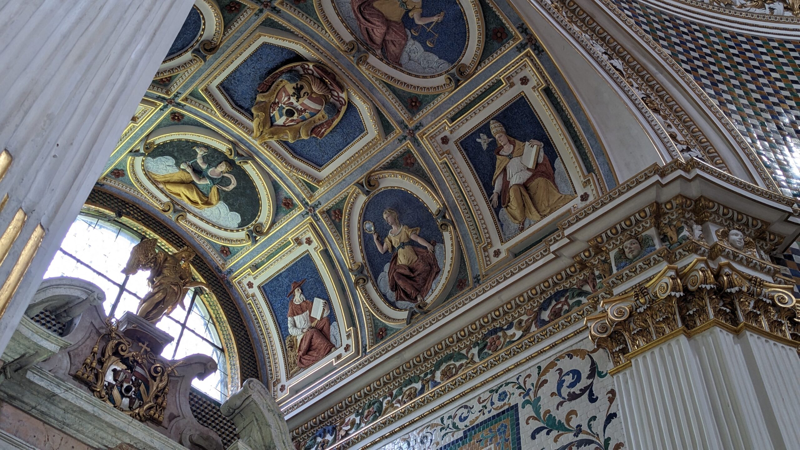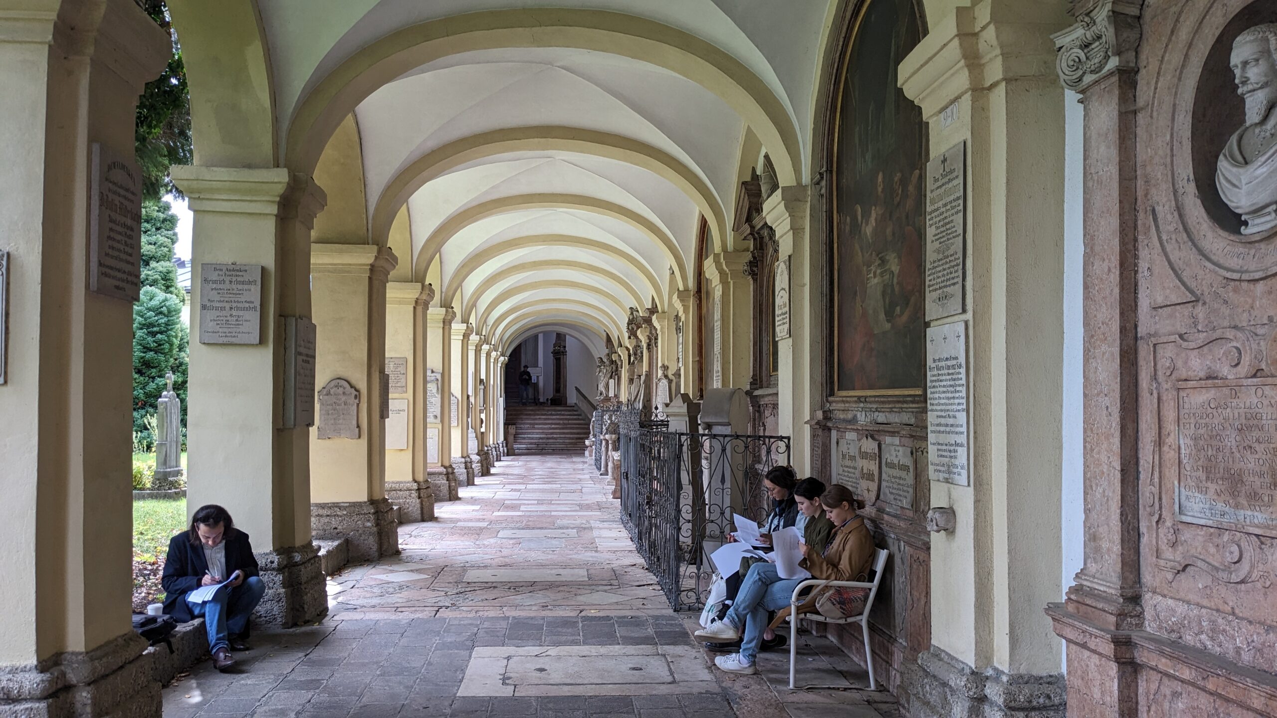 Bei erkennbar besserem Wetter fand am 14. Juni die zweite Heraldik-Exkursion von Matthias Weiß auf den Sebastiansfriedhof statt. Erfreulicherweise war auch die Gabrielskapelle geöffnet, die innen wie außen mindestens neunmal mit dem Wappen ihres Bauherrn Wolf Dietrich von Raitenau geschmückt ist, aber auch für andere Arbeitsgebiete der Kunstgeschichte reiches Anschauungsmaterial bereithält – christliche Ikonografie zum Beispiel und damit verbundene allegorische Darstellungen. Ein rundum lehrreicher Tag also, diesmal unter angenehmeren Bedingungen.