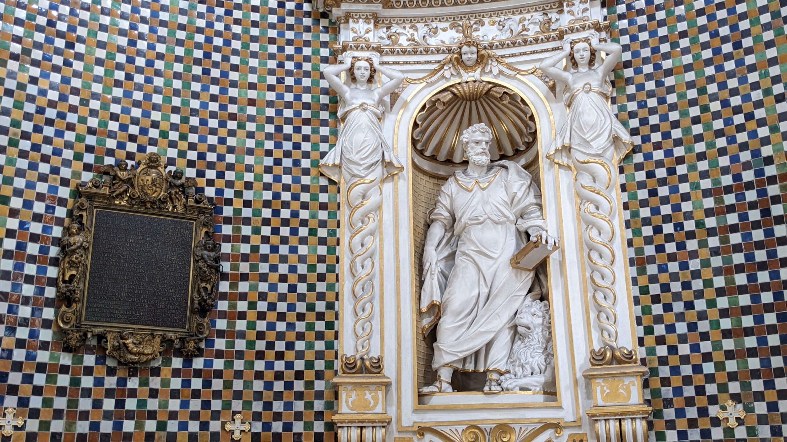 Der Evangelist Markus mit Löwen, links über dem Epitaph das Raitenau-Wappen. -