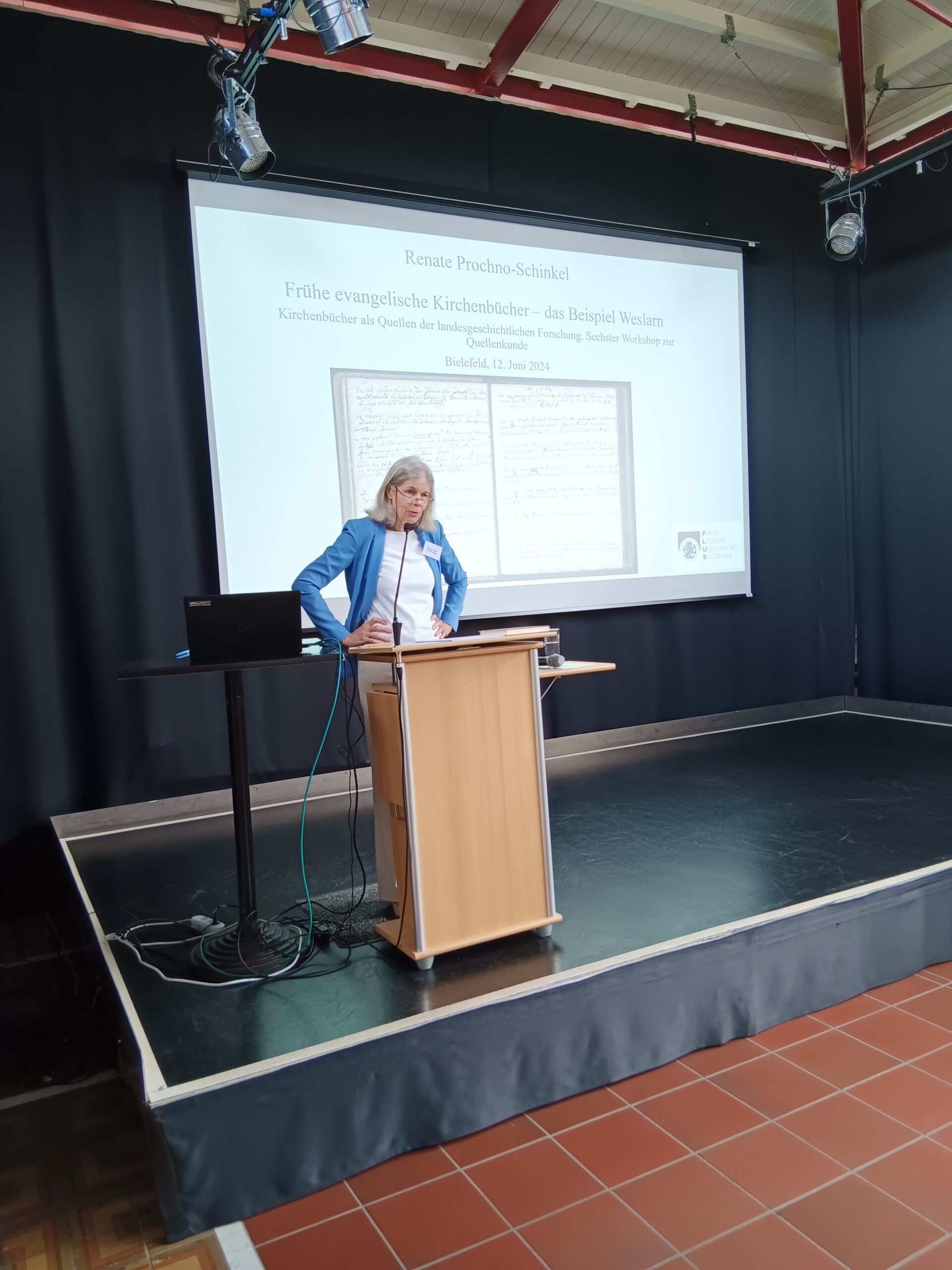 Die Edition und sozialgeschichtliche Auswertung der frühen Tauf- und Trauregister eines westfälischen Dorfes durch Renate Prochno-Schinkel aus dem Jahr 2019 war der Anlass zu einem Workshop der Historischen Kommission für Westfalen zu Kirchenbüchern als Quellen der landesgeschichtlichen Forschung. Im „Fabrikschloss“ der Ravensberger Spinnerei von 1854 in Bielefeld hielt sie einen Vortrag über „Frühe evangelische Kirchenbücher – das Beispiel Weslarn.“
