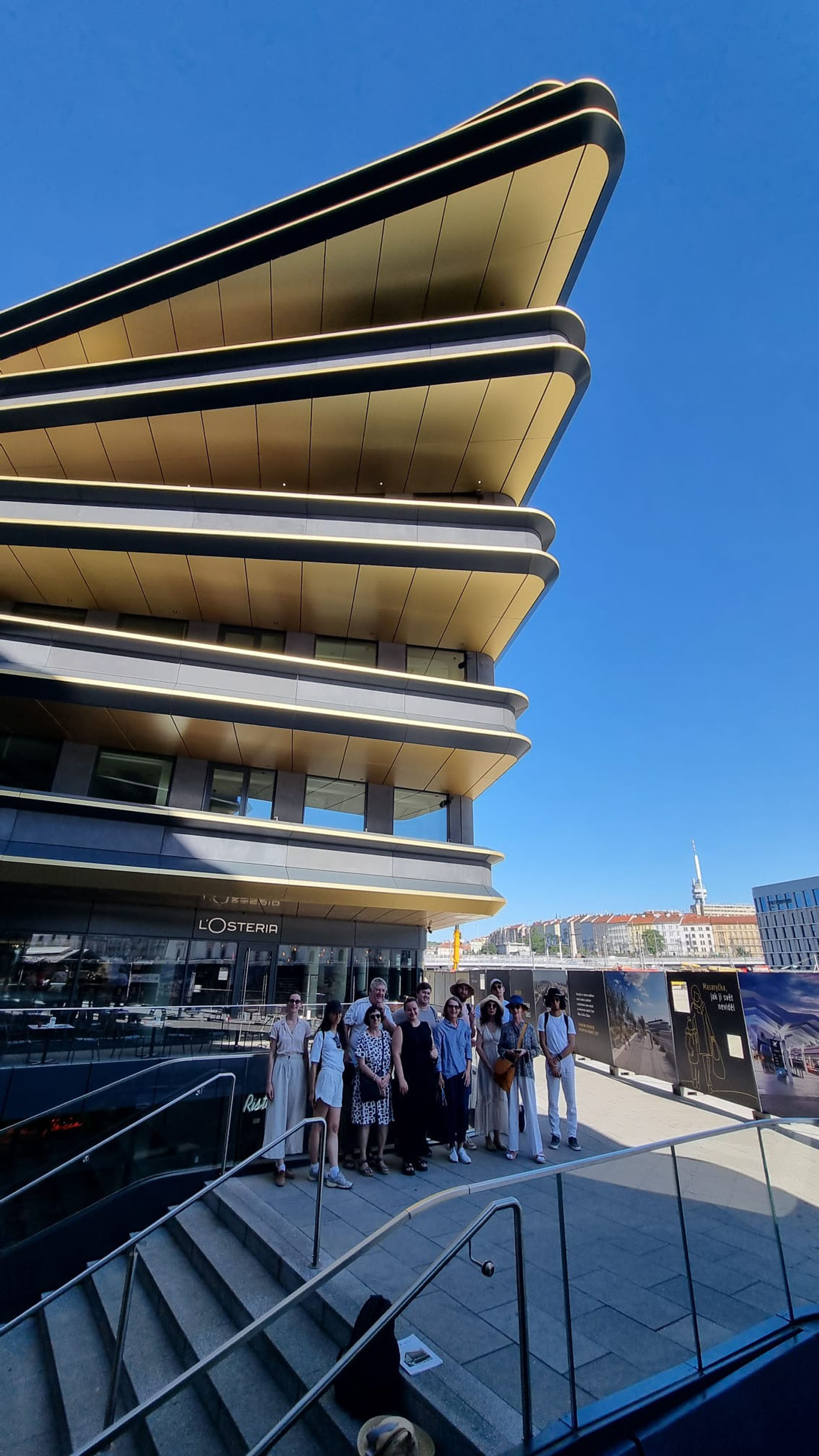 Spektakuläre Architektur konnte die Gruppe gleich gegenüber bestaunen: das 2023 eröffnete Masaryčka-Gebäude von Zaha Hadid Architects.