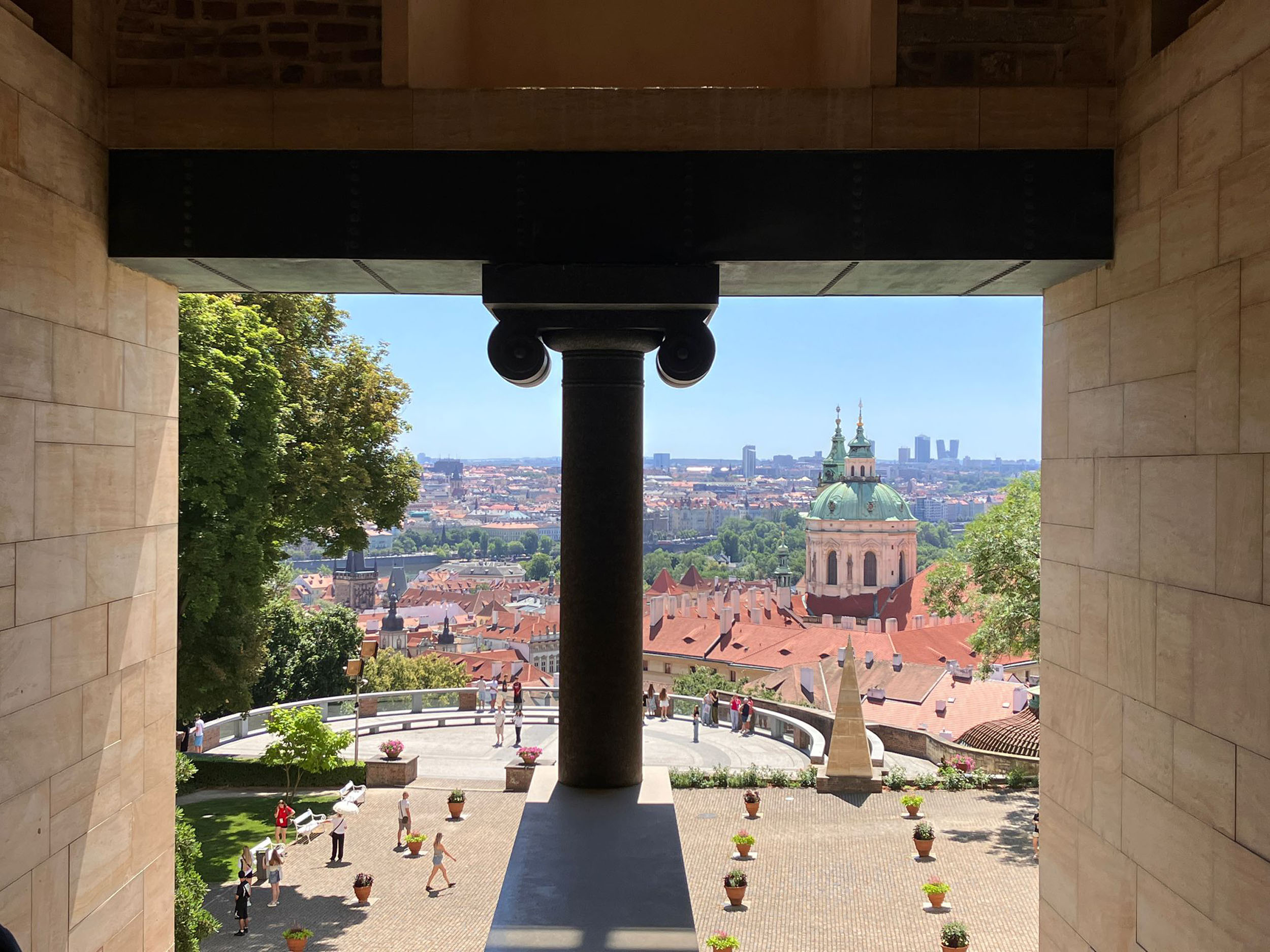 Neben dem Besuch des erst 1927 fertiggestellten Veitsdoms stand die Umgestaltung der Prager Burg durch Jože Plečnik, hier die Stiertreppe mit Aussicht auf die Niklaskirche, am Vormittag im Zentrum der Aufmerksamkeit.