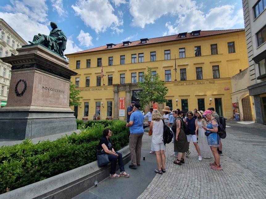 Der letzte Tag der Exkursion begann auf dem Wenzelsplatz und dessen avantgardistischen Architekturen der Zwischenkriegszeit. In der Nähe des Jungmann-Platzes steht nicht nur die bemerkenswerte kubistische Straßenlaterne, die in keinem Architekturführer fehlt, sondern auch das Denkmal des Namensgebers, Josef Jungmann, dem als Wegbereiter der erneuerten tschechischen Sprache 1878 diese öffentliche Wertschätzung zuteilwurde.