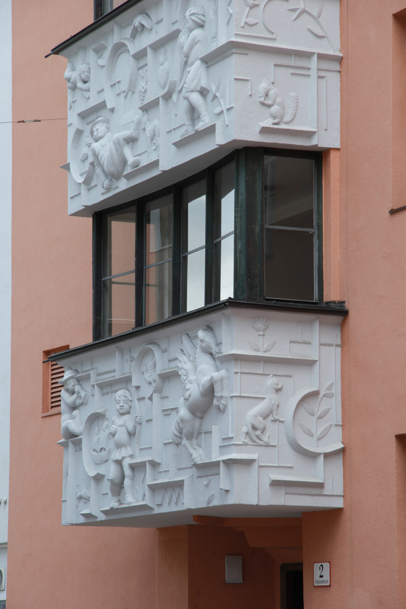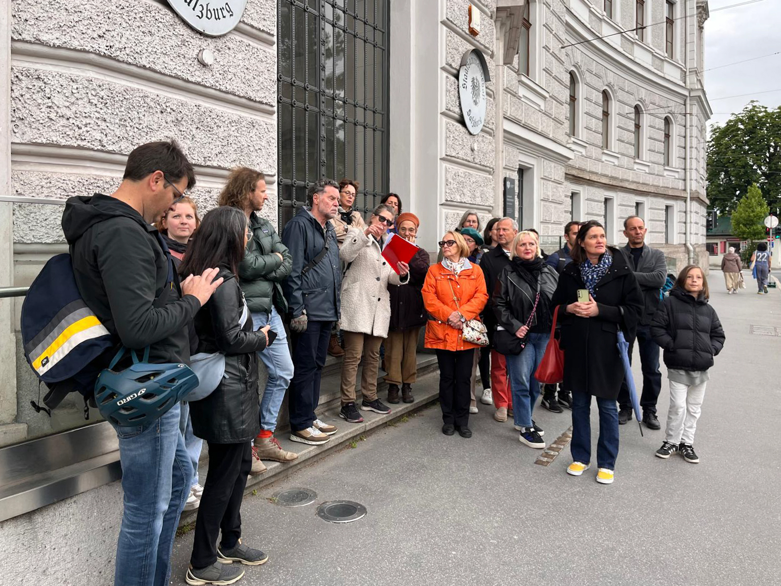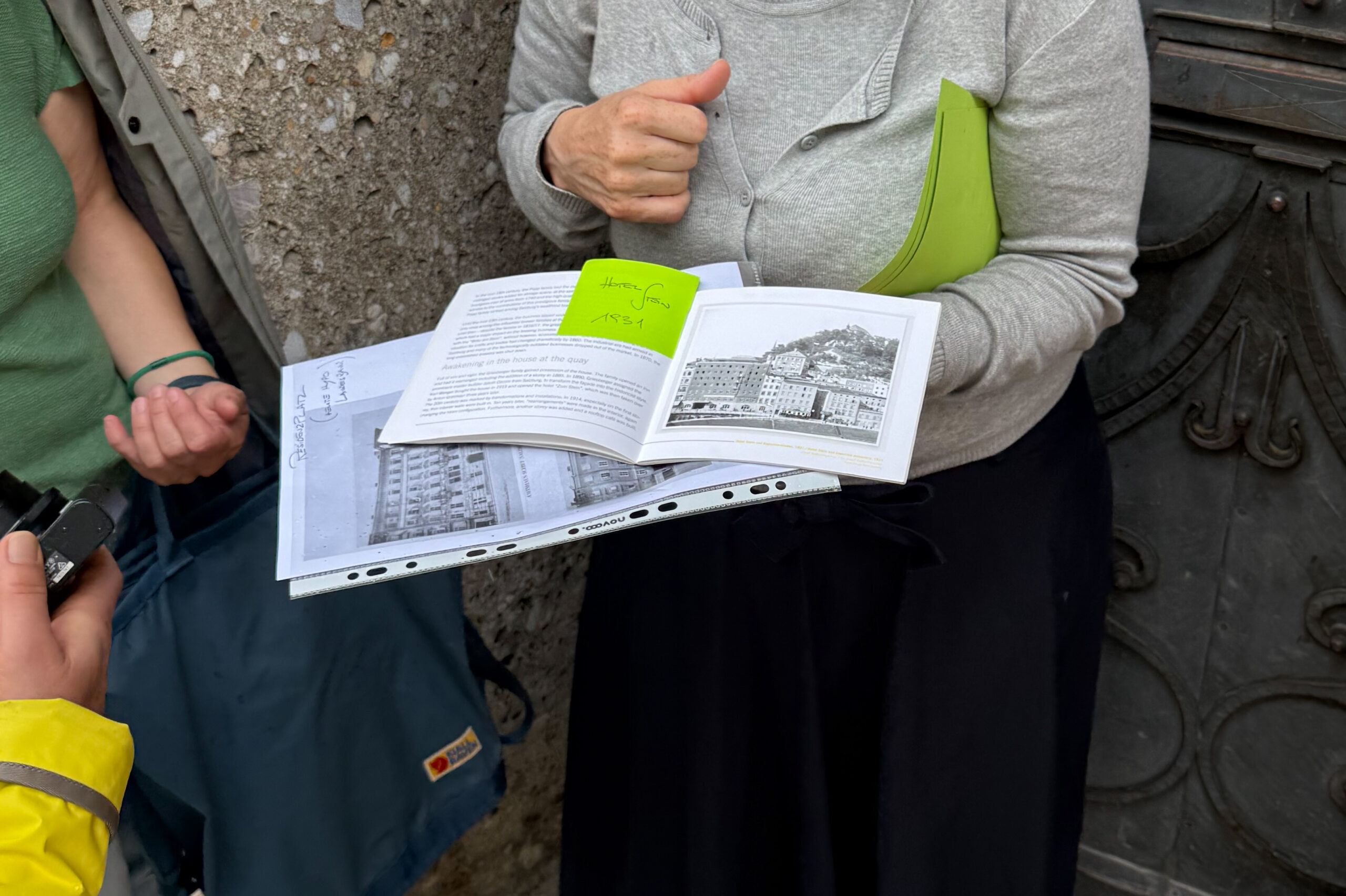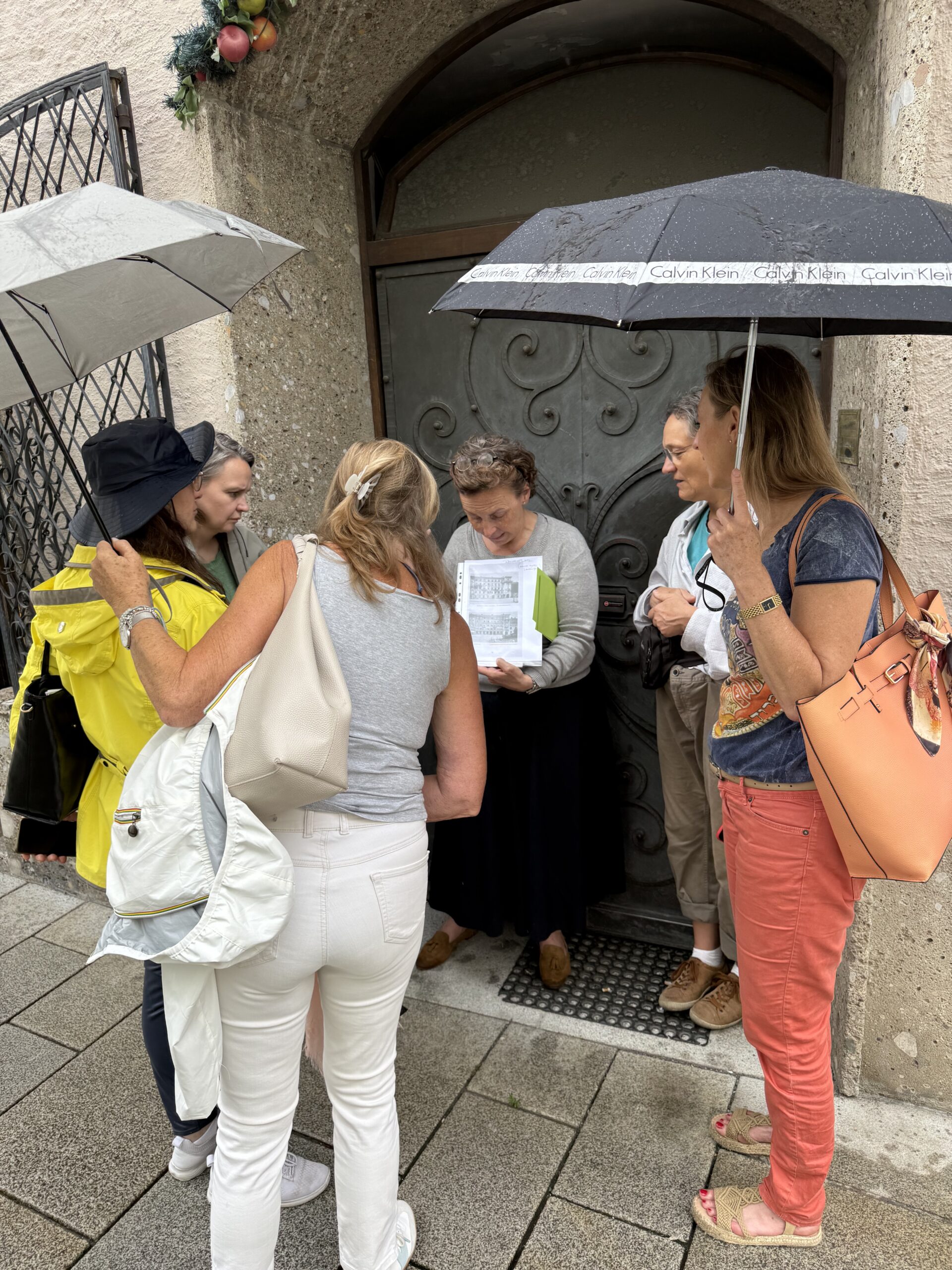 Die zweite Führung boten Ende Juni Ilona Wachter und Lisa Kranabetter an. Besichtigt wurden das Kieselgebäude (Wunibald Deininger, 1924–26), die Wiener Städtische Versicherungsanstalt (Paul Geppert d. Ä., 1932–33), der Salzburger Autopalast (Zöttl und Sperl, ab 1928) sowie der Sitz des ehemaligen Katholischen Pressvereins (Fassade: Paul Geppert d. J., 1937), der heute als KunstQuartier firmiert. Dass einer der Hauseigentümer unter den Teilnehmenden war und aus erster Hand Familiengeschichten beitrug, verlieh auch diesem Termin eine besondere Lebendigkeit.