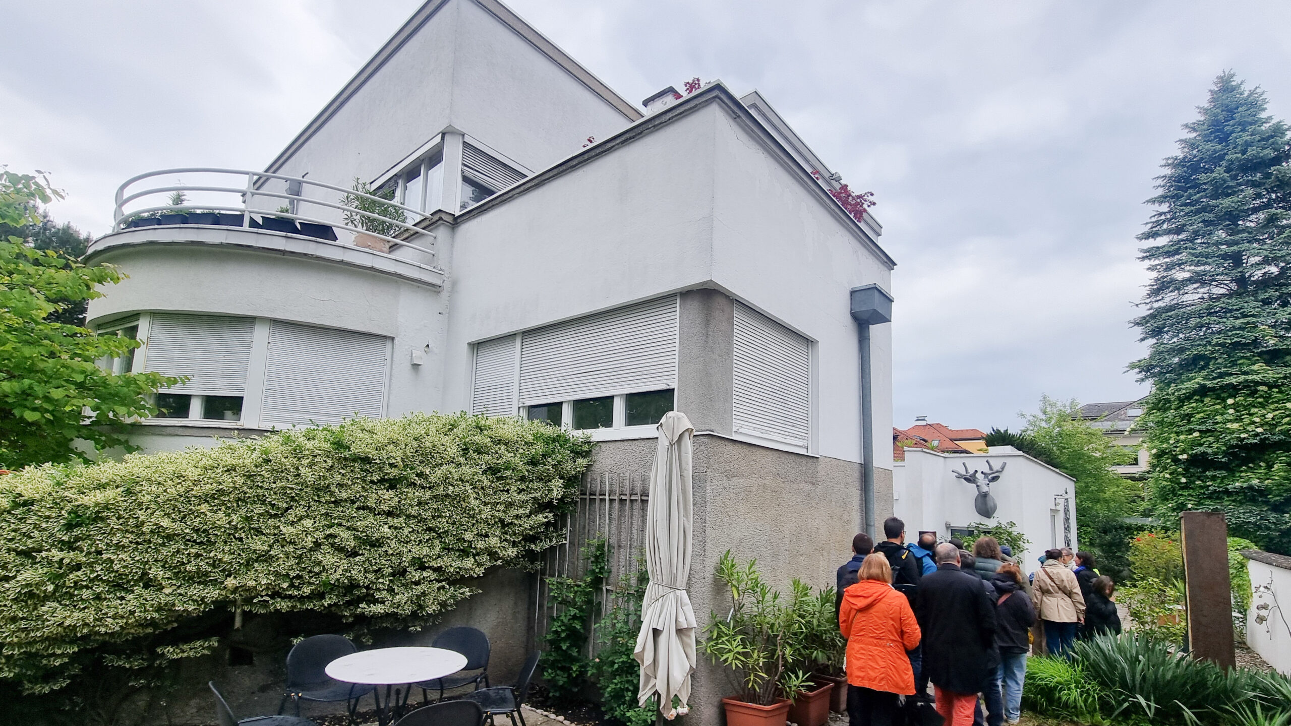 Am 23. Mai übernahm Astrid Graf-Wintersberger die erste Tour zur ehemaligen Polizeikaserne (heute Bezirksgericht), 1930 von Wunibald Deininger errichtet. Es folgten Deiningers Wohn- und Atelierhaus in der Arenbergstraße (1927/28) sowie das Haus Weidlich in Parsch (1932) – ein Gebäude, das trotz mehrfacher Um- und Ausbauten sein modernes Gepräge bewahrte. Vielen Dank an das Galeristenpaar Mauroner, das uns bereitwillig die Türen öffnete.