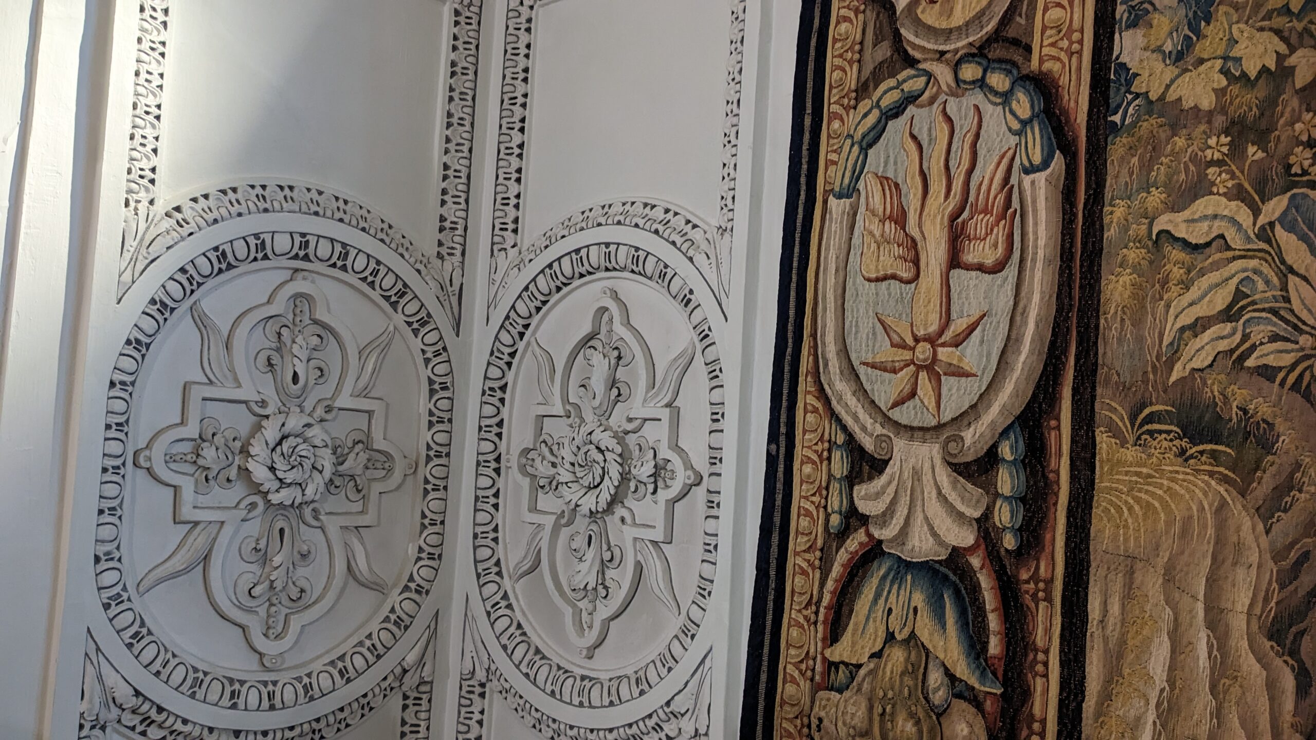Ungeklärt: Das emblematische oder heraldische Motiv in der Bordüre liefert ‚Stoff‘ für eine Masterarbeit.
