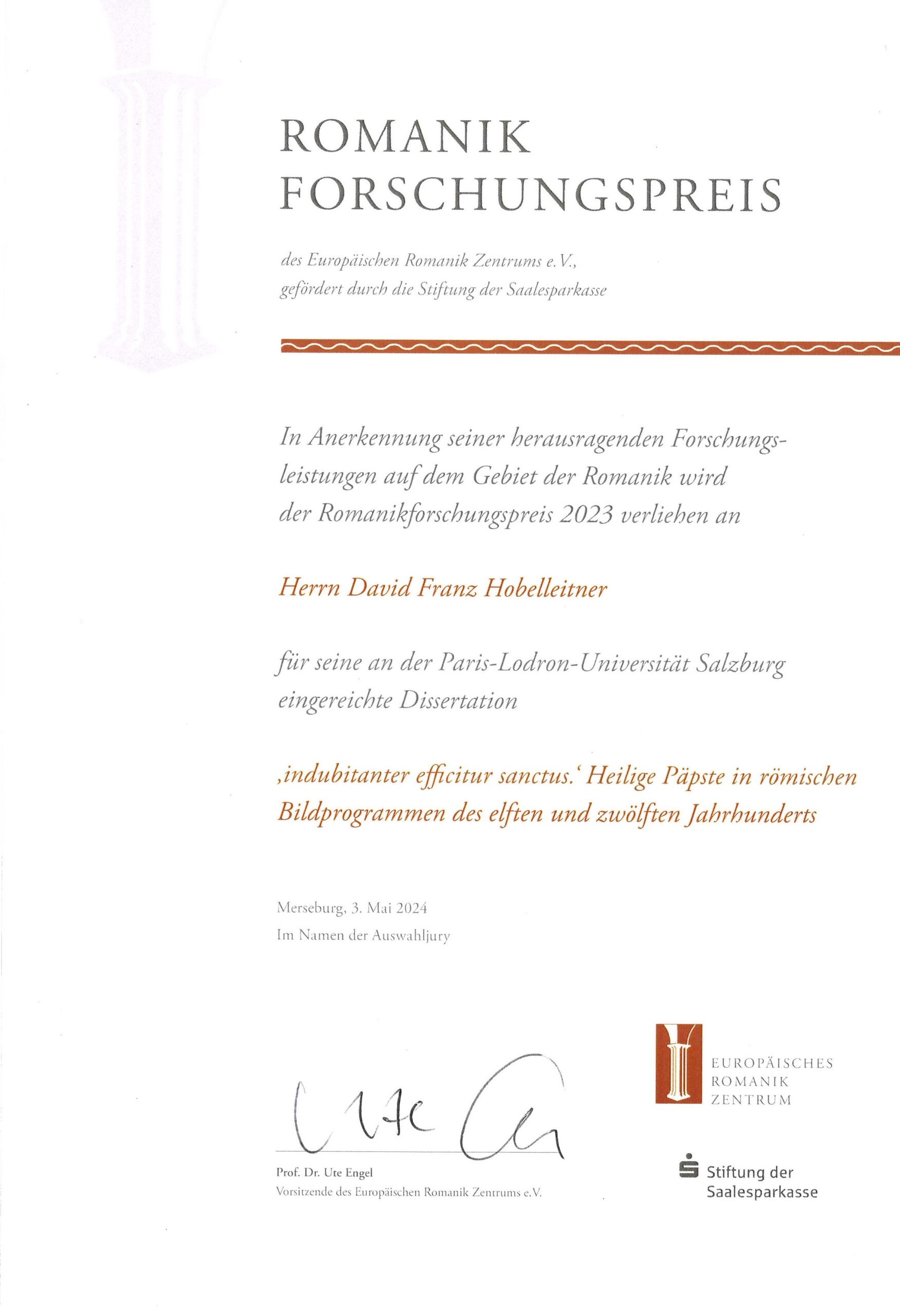 Vergangenen Freitag fand im Europäischen Romanik Zentrum in Merseburg die Verleihung des 12. Romanikforschungspreises statt. Ausgezeichnet wurde David Hobelleitner mit seiner in Salzburg eingereichten und verteidigten Dissertation mit dem Titel „indubitanter efficitur sanctus.“ Heilige Päpste in römischen Bildprogrammen des elften und zwölften Jahrhunderts. Ute Engel, Professorin für Kunstgeschichte des Mittelalters an der Martin-Luther-Universität Halle-Wittenberg, hielt eine ehrenvolle Laudatio auf die Arbeit des Preisträgers, ehe Susanne Wittekind, Professorin für Mittelalterliche Kunstgeschichte an der Universität zu Köln, im Festvortrag zum Thema „Von Rom nach Spanien. Liturgie und Wandmalerei im Hochmittelalter“ sprach. Im Anschluss wurde im Kreuzgang des Merseburger Doms mit den zahlreichen Gästen und Mitgliedern des Romanikzentrums auf den freudigen Anlass angestoßen.