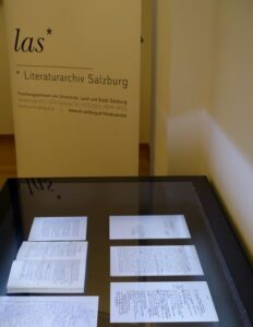 Aus Anlass des 80. Geburtstag von Peter Handke präsentierte das Literaturarchiv in einer kleinen Vitrinen-Ausstellung zentrale Dokumente aus seinem Bestand, die mit Salzburg in einem besonderen Zusammenhang stehen. Sie waren bis Ende Februar 2023 in unserem Veranstaltungssaal zu sehen. Peter Handke lebte von 1979 bis 1987 in Salzburg („Kupelwieserschlössl“ am Mönchsberg), wo zahlreiche seiner Werke entstanden.