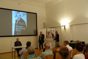 Martin Huber, der über mehrere Jahre als wissenschaftlicher Mitarbeiter am Literaturarchiv tätig war, und Wolfgang Straub stellten am 7. Juni 2023 um 19 Uhr im Veranstaltungssaal des LAS (Kapitelgasse 5-7, 2. Stock) im Gespräch mit Manfred Mittermayer ihr neues Buch über die Wiener Schauplätze von Thomas Bernhards Werk vor. Der bekannte Burgschauspieler Martin Schwab, der zahlreiche Rollen in Ur- und späteren Aufführungen von Bernhards Theaterstücken verkörperte, las aus Texten des Autors.