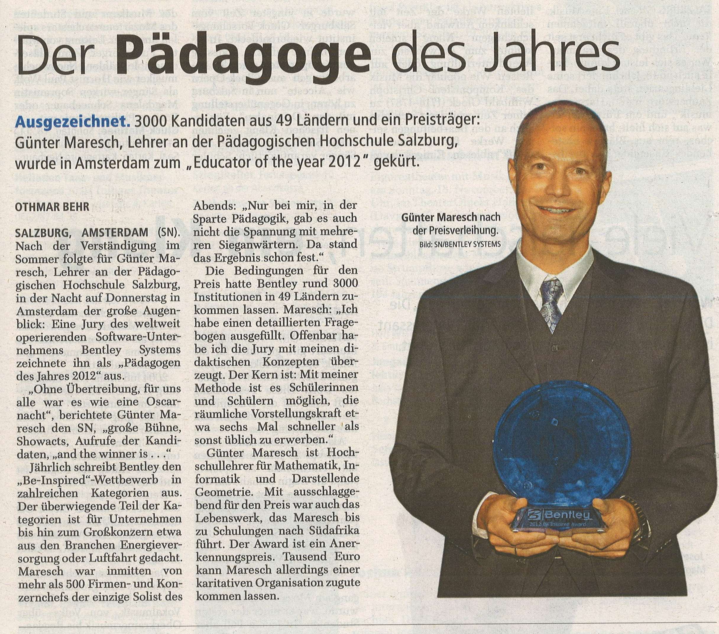 Der Fachbereich Mathematik gratuliert seinem langjährigen Lehrbeauftragten Dr. Günter Maresch zum Gewinn des weltweiten Wettbewerbs „2012 Bentley Educator of the Year“. Der Preis wird am 14.11.2012 verliehen.