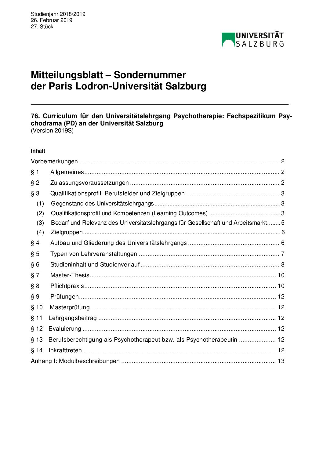 76. Curriculum für den Universitätslehrgang Psychotherapie: Fachspezifikum Psychodrama (PD) an der Universität Salzburg