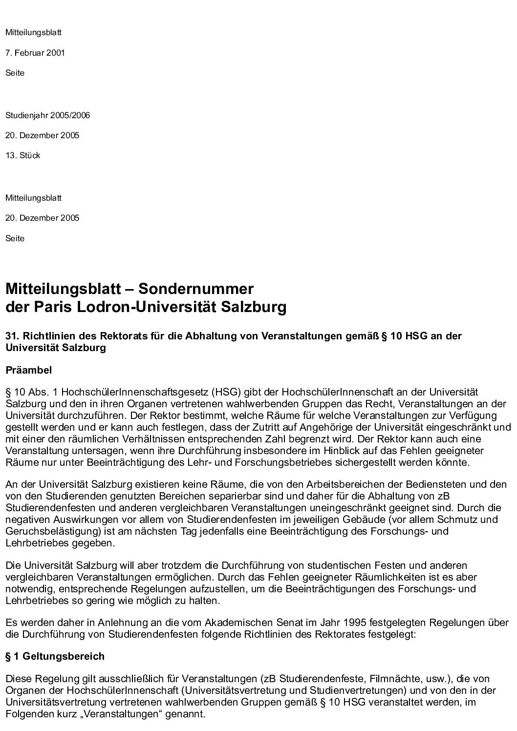 31. Richtlinien des Rektorats für die Abhaltung von Veranstaltungen gemäß § 10 HSG an der Universität Salzburg