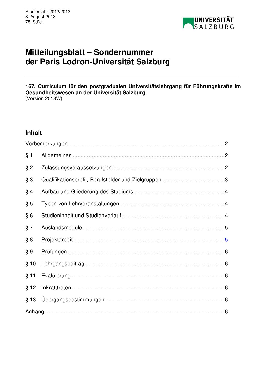 167. Curriculum für den postgradualen Universitätslehrgang für Führungskräfte im Gesundheitswesen an der Universität Salzburg