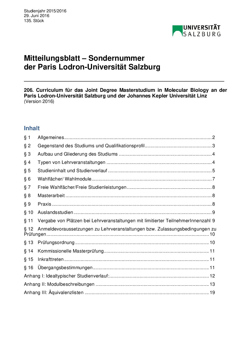 206. Curriculum für das Joint Degree Masterstudium in Molecular Biology an der Paris Lodron-Universität Salzburg und der Johannes Kepler Universität Linz