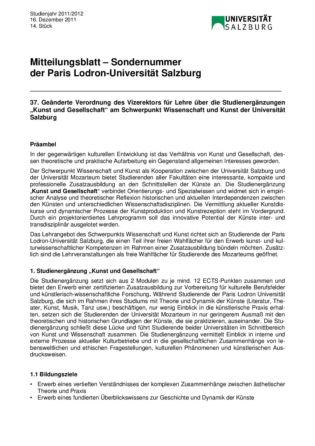 37. Geänderte Verordnung des Vizerektors für Lehre über die Studienergänzungen „Kunst und Gesellschaft“ am Schwerpunkt Wissenschaft und Kunst der Universität Salzburg