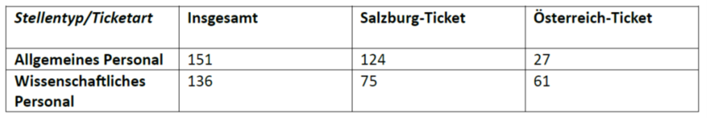 Der springende Anteil des ÖV an der PLUS kann somit weniger mit einer Verhaltensänderung der Kfz-Benutzer*innen in Verbindung gebracht werden, sondern mit der Einführung des KlimaTickets 2021. Dieses ist für Studierende durch den entsprechenden Gruppentarif wesentlich kostengünstiger als die vorhergehenden Angebote. Für die Mitarbeiter*innen der PLUS ist der Preis des KlimaTickets durch die Förderung für Mitarbeiter*innen besonders attraktiv. Seit 2023 wurde der Kreis der Bezugsberechtigten auf Projektmitarbeiter*innen ausgeweitet. Insgesamt wurden 287 KlimaTickets vom 01.01.2022 bis 30.06.2023 durch die PLUS gefördert. Das Salzburg-Ticket wird mit 110 Euro gefördert, das Österreich-Ticket mit 220 Euro.