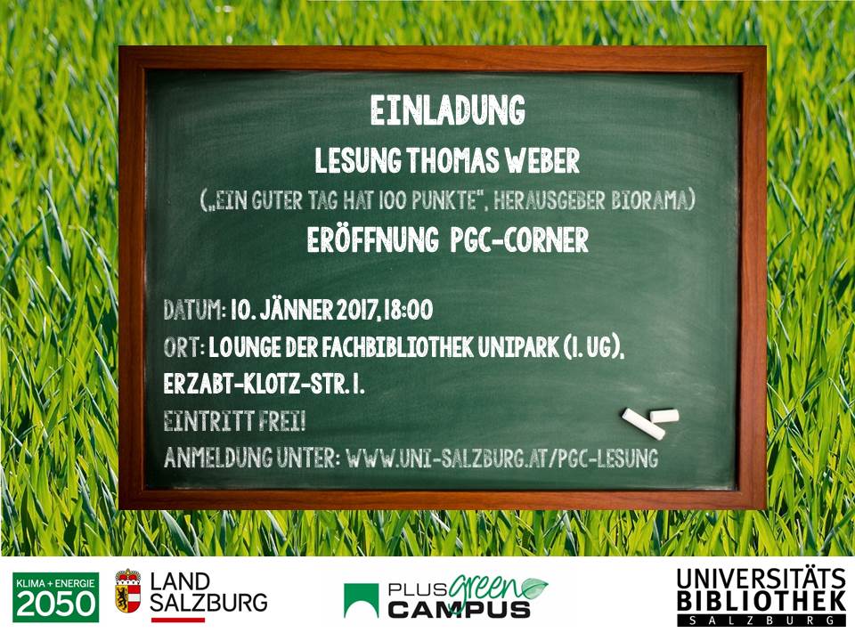 Die Lesung findet im Rahmen der Eröffnung des PGC Corners statt, in dem interessante Bücher rund ums Thema Nachhaltigkeit ausgestellt werden. Aufgrund der limitierten Plätze bitten wir um Anmeldung unter: www.uni-salzburg.at/pgc-lesung.