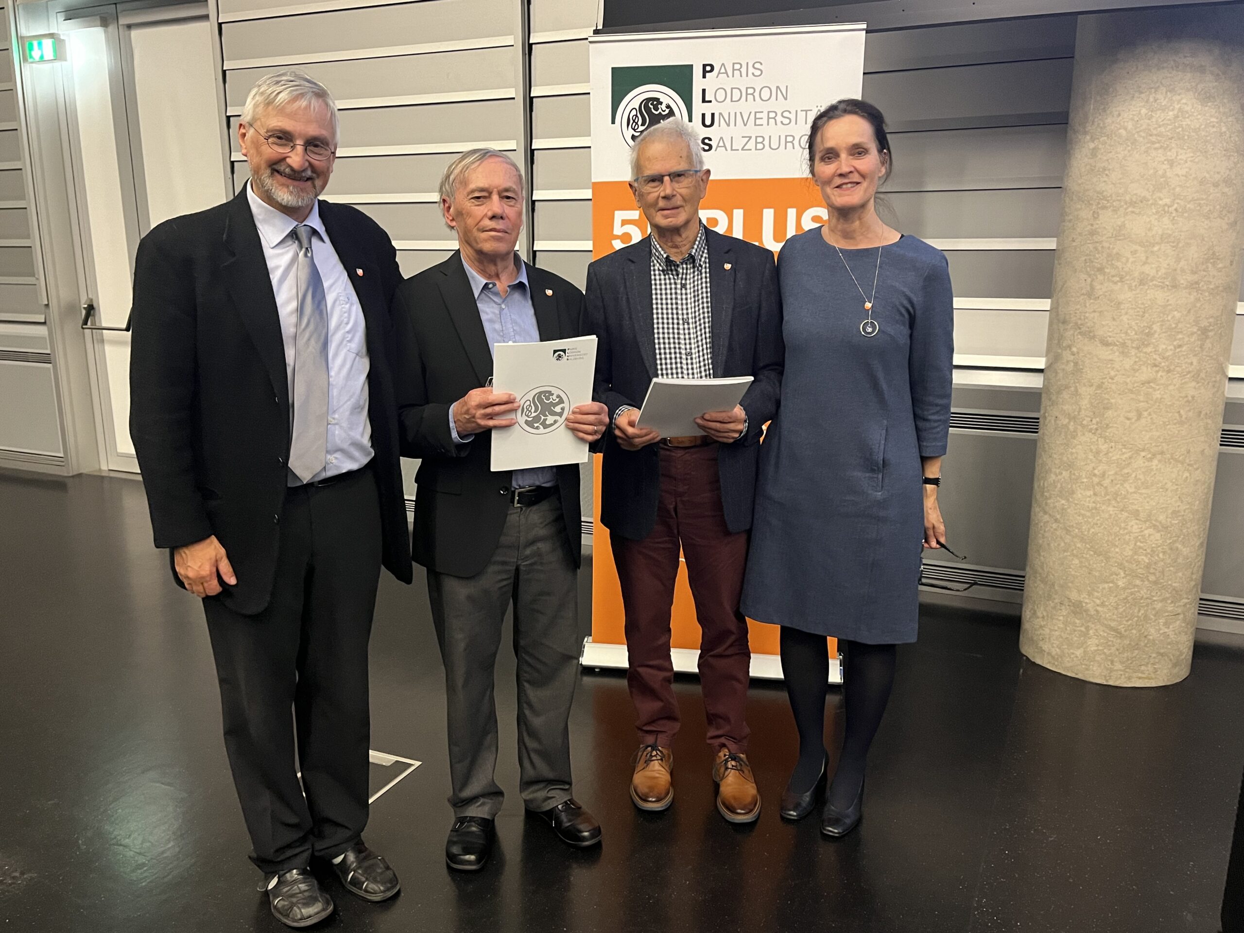 Im Rahmen des traditionellen Festaktes Mitte Oktober 2024 wurden Thomas Schmidt und Dr. Gunther Seidl Mitte Oktober mit der Ehrenmitgliedschaft der Uni 55-PLUS ausgezeichnet. Die Ehrenmitgliedschaft ist eine besondere Auszeichnung, die das außergewöhnliche Engagement sowie die langjährigen Verdienste der Geehrten würdigt. Beide neuen Ehrenmitglieder gestalteten im Rahmen des Teilnehmer:innenrates die Uni 55-PLUS seit Anbeginn mit. „Thomas Schmidt und Gunther Seidl verkörpern die Uni 55-PLUS durch ihre Ideen und kritischen Beiträge.“, erklärte Univ.-Prof. Dr. Dr. Susanne Ring-Dimitriou, die Leiterin der Uni 55-PLUS, in ihrer Laudatio.