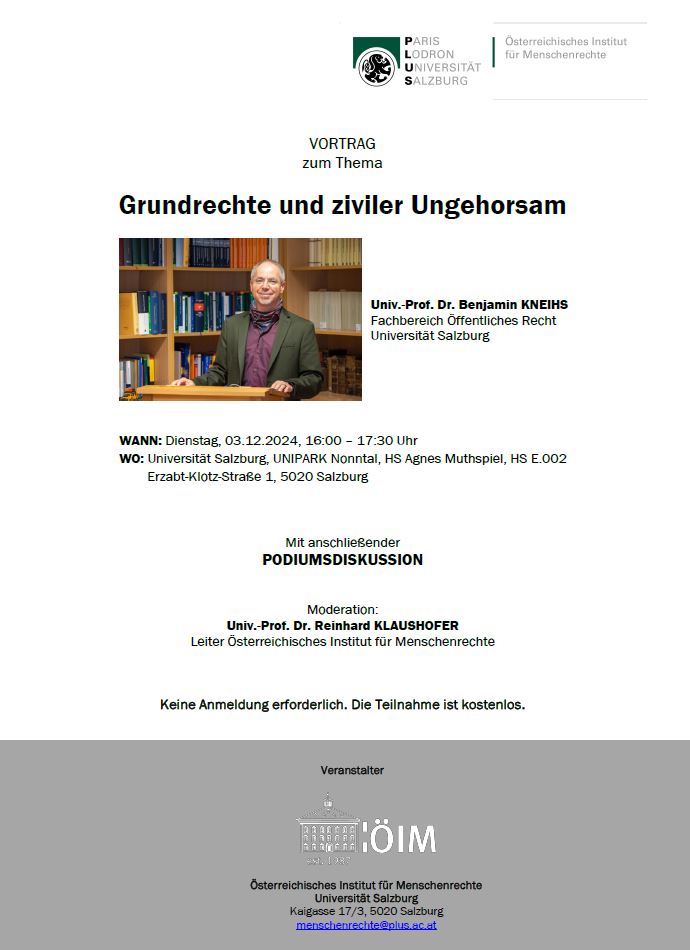 Das Österreichische Institut für Menschenrechte lädt zum Vortrag „Grundrechte und ziviler Ungehorsam“ von Univ.-Prof. Dr. Benjamin Kneihs, Fachbereich Öffentliches Recht, Paris Lodron Universität Salzburg.
