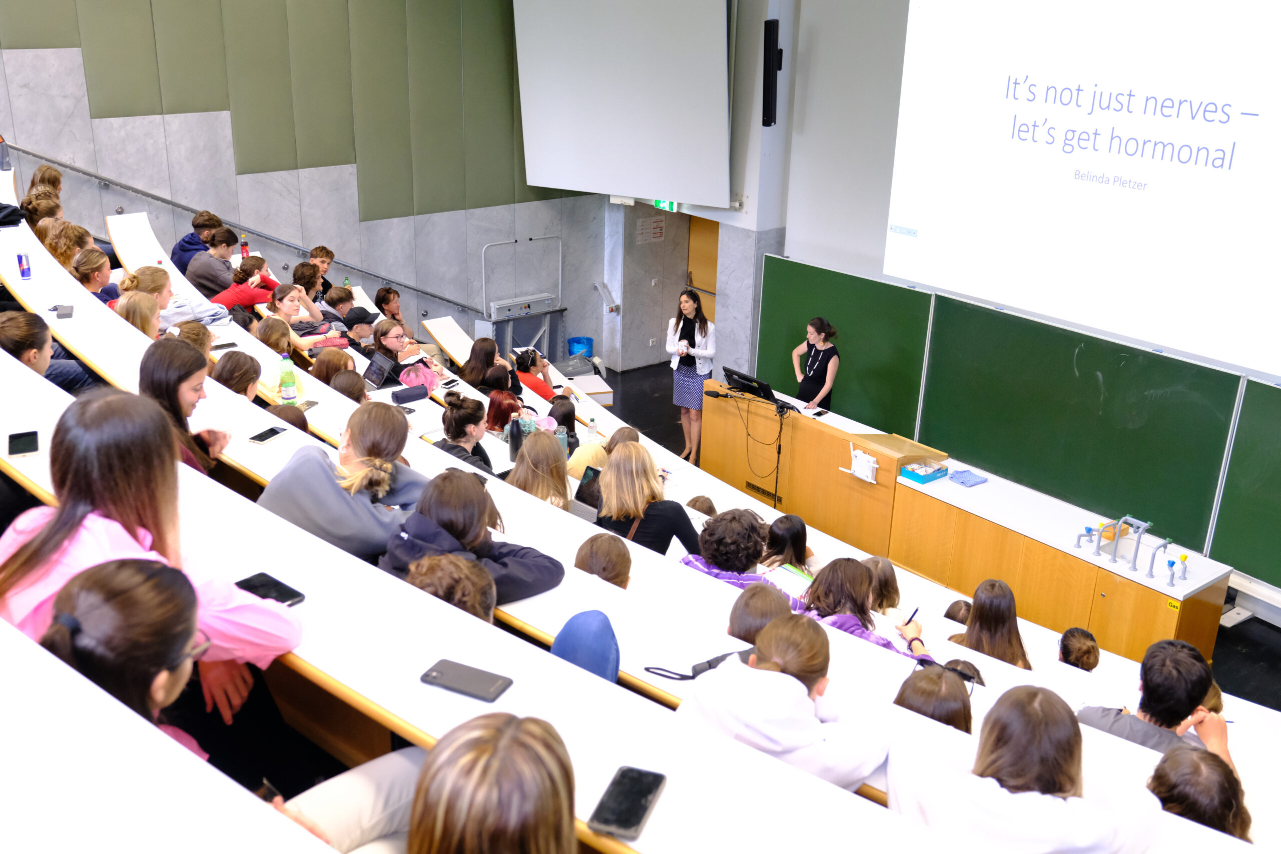 Obwohl schon lange bekannt ist, dass die Pille einerseits Stimmungsschwankungen verbessert, andererseits bei manchen Frauen auch psychische Nebenwirkungen haben kann, beantworten bislang nur sehr wenige Studien deren Einfluss auf das Gehirn. Der Vorlesungsteil beleuchtet vorerst die Zusammenarbeit von Hormon– und Nervensystem von Frau und Mann, um anschließend auf die Forschungsfrage und das Studiendesign einzugehen. Das junge Publikum brachte einiges an Vorwissen und noch mehr interessierte Fragen mit.