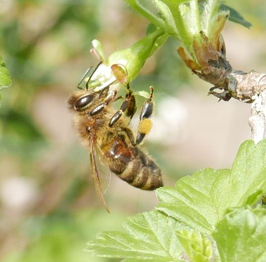 Honeybee (Apis mellifera) visiting a gooseberry flower