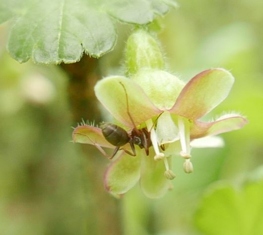 The famous honeybee (Apis mellifera) was definitely the most frequent visitor of both plant species. In second place are the tawny mining bee (Andrena fulva) and the large earth bumblebee (Bombus terrestris). Also other bee- and bumblebee species were observed. Interestingly, wasps also visited the flowers of both plant species and syrphid flies visited only black currants. Moreover it was observed, that many ants frequented the gooseberry flowers. It’s already assumed that they can act as pollinators (Rostás und Tautz 2010), but further studies are required to resolve this debate.