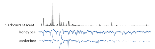 The components of the black currant scent are visible as peaks of the black graph. The electric signals of the insect antennae to the individual components are visible in the two blue graphs below.