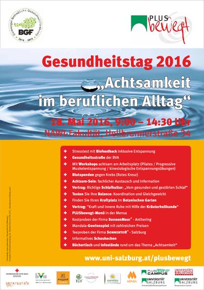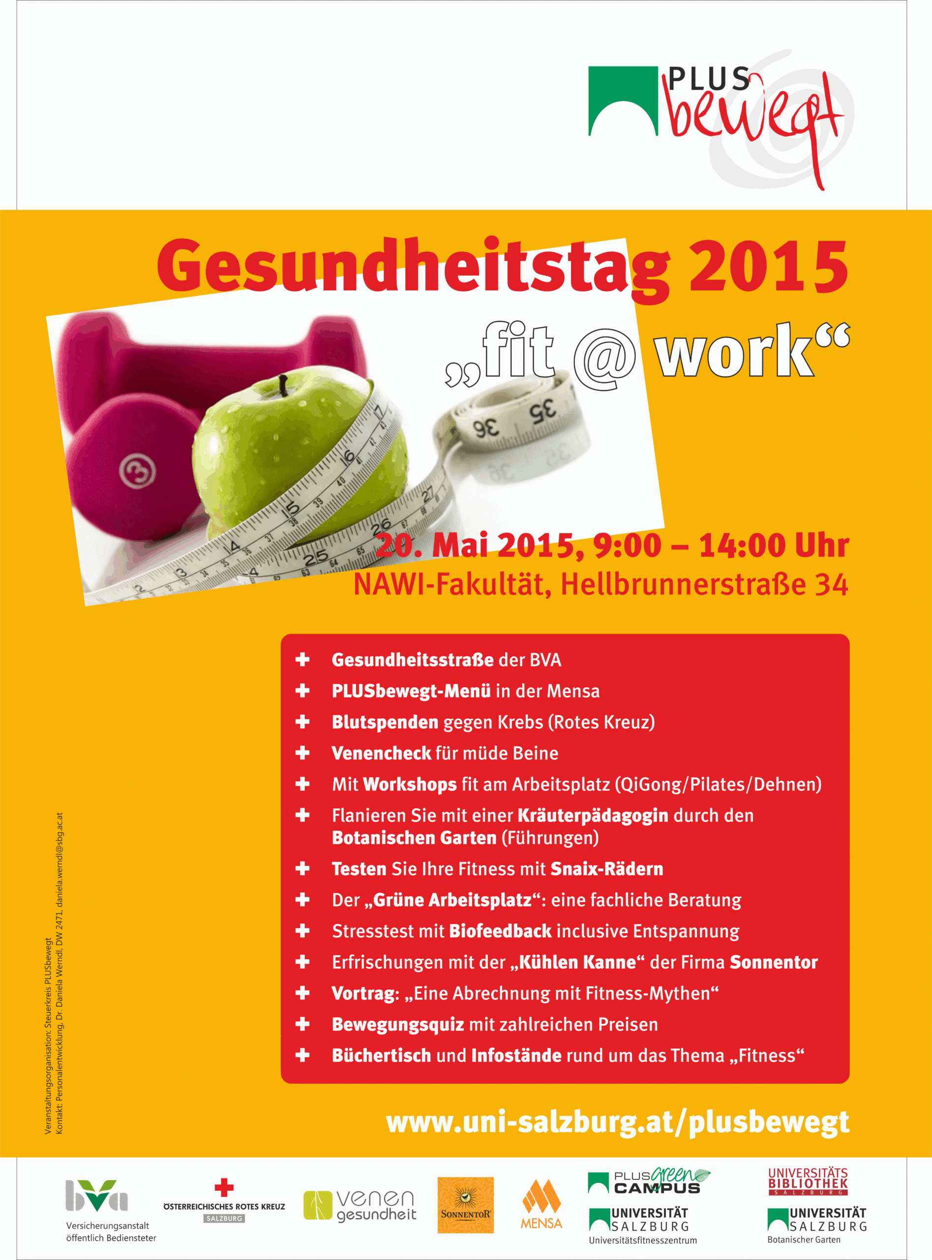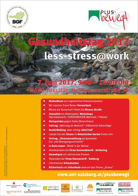 Einmal jährlich wird an der PLUS ein Gesundheitstag mit einem thematischen Schwerpunkt organisiert. Gemeinsam getragen werden diese Veranstaltungen von universitätsinternen Stellen wie Arbeitsmedizinischer Dienst, Betriebsrat 2, Diversity & Disabilty, Universitätsbibliothek, Universitäts-Sportinstitut und Personalentwicklung. Durch die Unterstützung der BVAEB oder der MensenGmbH kann das jeweilige Programm noch attraktiver gestaltet werden. Initiativen, Leistungen und neue Herausforderungen im Rahmen des betrieblichen Gesundheitsmanagements können bei diesen Veranstaltungen den Mitarbeiter*innen der Universität vorgestellt werden und zu breiter Mitwirkung der Kolleginnen und Kollegen anregen.