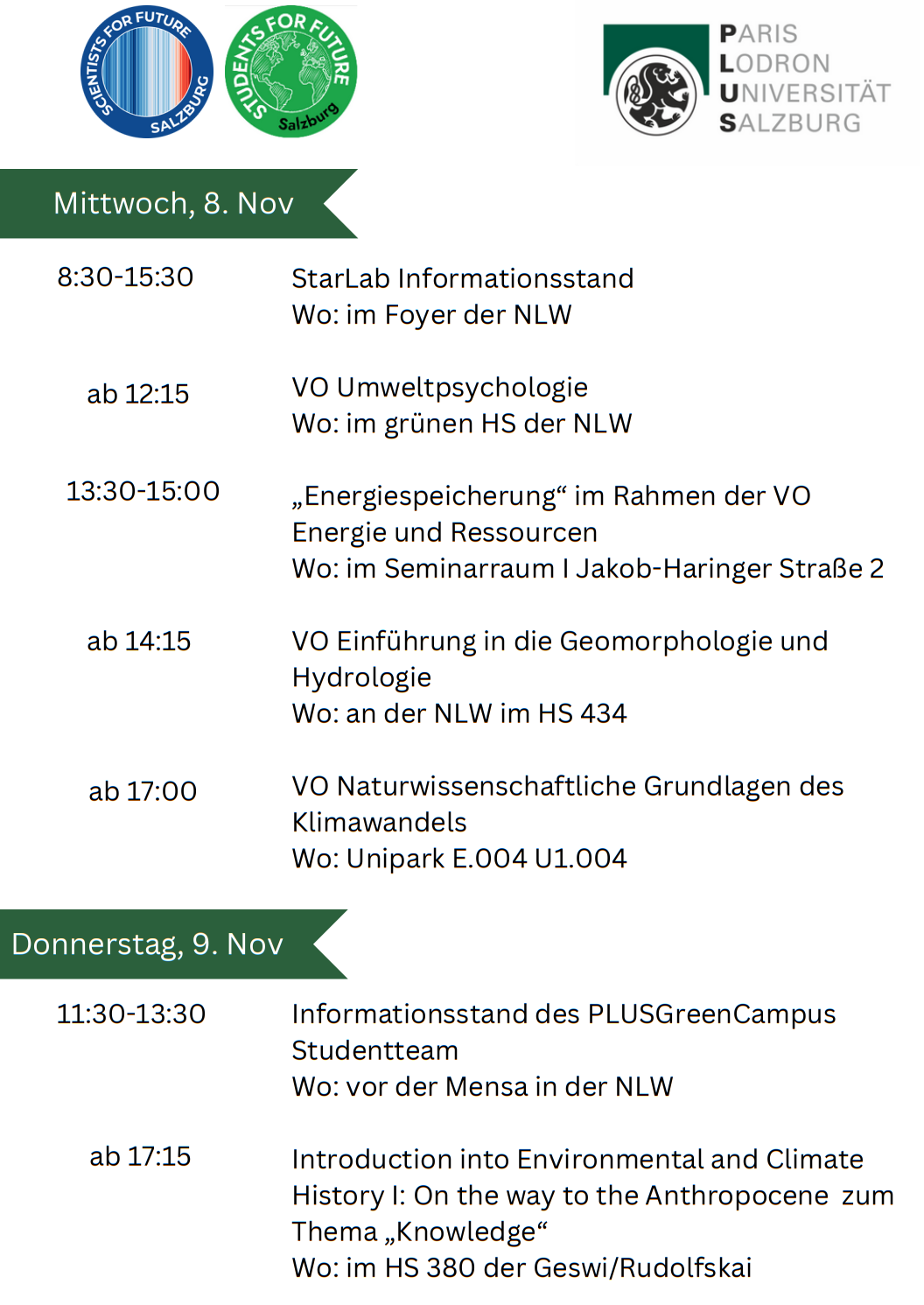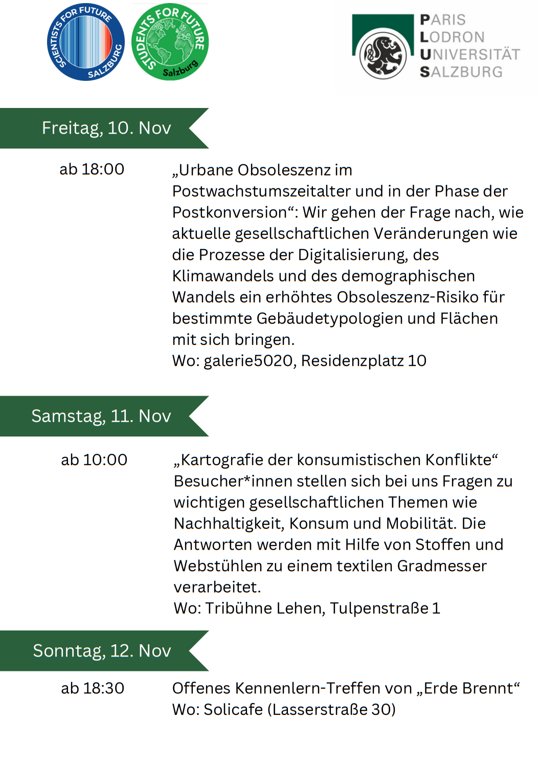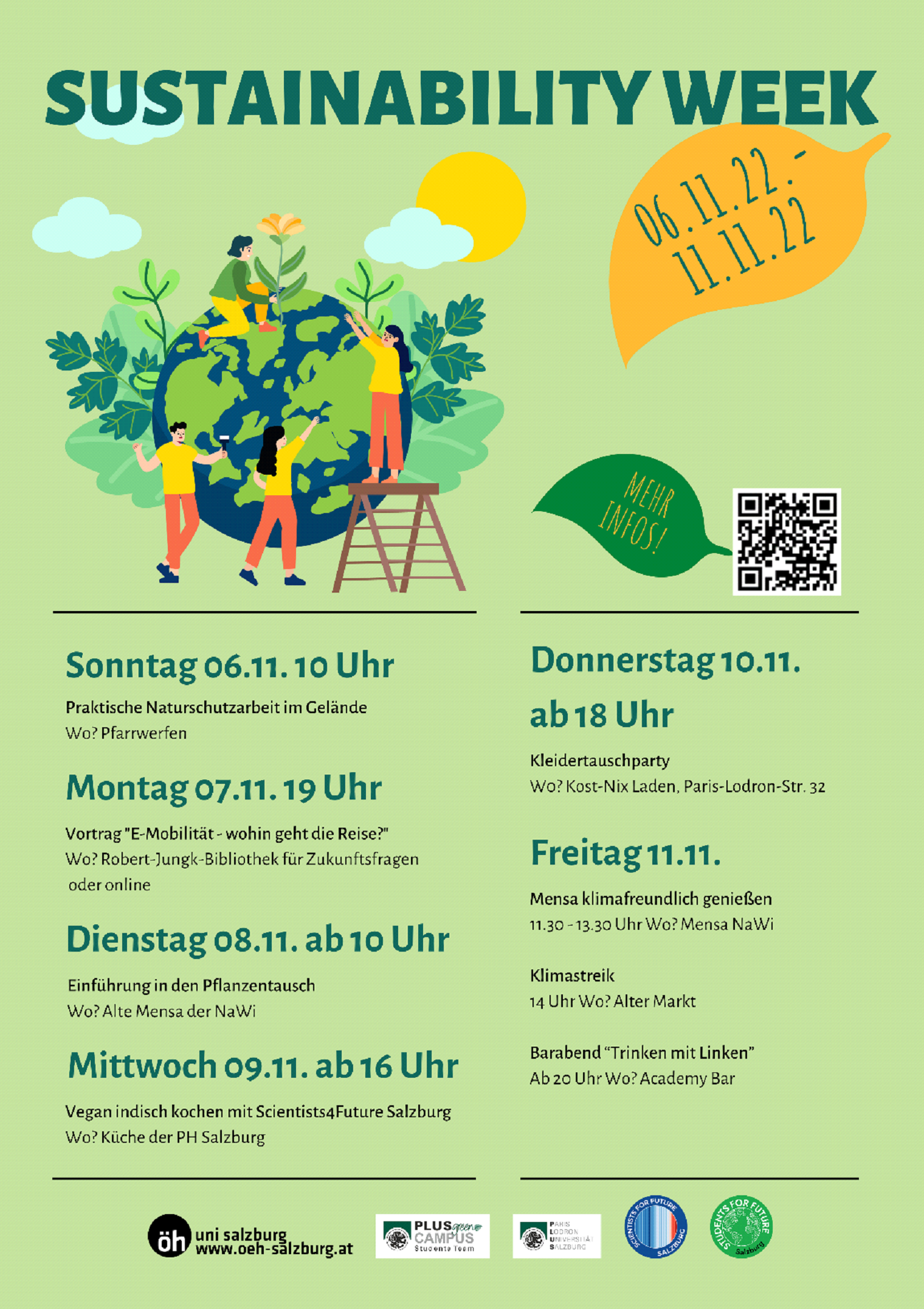 In Salzburg findet zudem zeitgleich in Kooperation mit Hochschulen und Universitäten Salzburgs die Sustainability Week statt. Es werden zusätzlich Vernetzungstreffen, Workshops etc. für Studierende und Mitarbeiter*innen der Institutionen angeboten.
