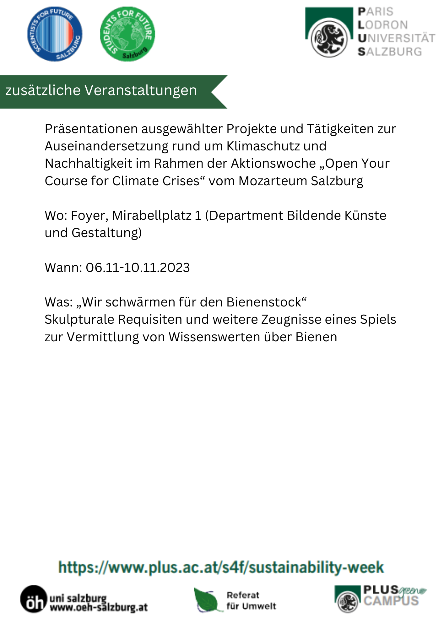 Die „Open your Course 4 Climate Crisis“ ist eine Woche, in der Hochschullehrende aufgefordert sind, das Thema Nachhaltigkeit und Klimawandel fachspezifisch in Ihren LVAs zu integrieren. In Salzburg findet gleichzeitig die Sustainability Week statt, in der man sich vernetzen kann und einen Überblick bekommt was es zu den Themen in Salzburg schon alles gibt. Es gibt Programmpunkte wie interessante LVAs zum Reinschnuppern, Informationsstände, offene Kennenlern-Treffen, Slams u.v.m.