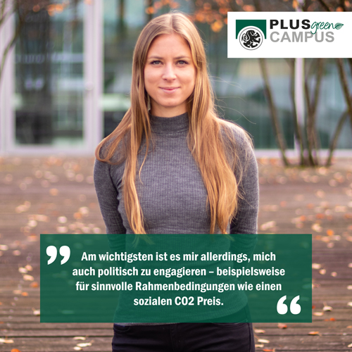 „Ich konsumiere und ernähre mich bewusst und nachhaltig. Auch bezüglich Mobilität und Reisen ist mir Nachhaltigkeit sehr wichtig. Zudem habe ich zu einer Grünen Bank und Ökostrom gewechselt. Am wichtigsten ist es mir allerdings, mich auch politisch zu engagieren – beispielsweise für sinnvolle Rahmenbedingungen wie einen sozialen CO2 Preis.. Meiner Meinung nach können wir als Studierende am meisten bewirken, indem wir wiederholt über die Klimakrise sprechen – mit unseren Studienkolleg*innen, den Lehrenden aber auch Freunden und Familie – und damit ein Bewusstsein für diese Thematik schaffen.“