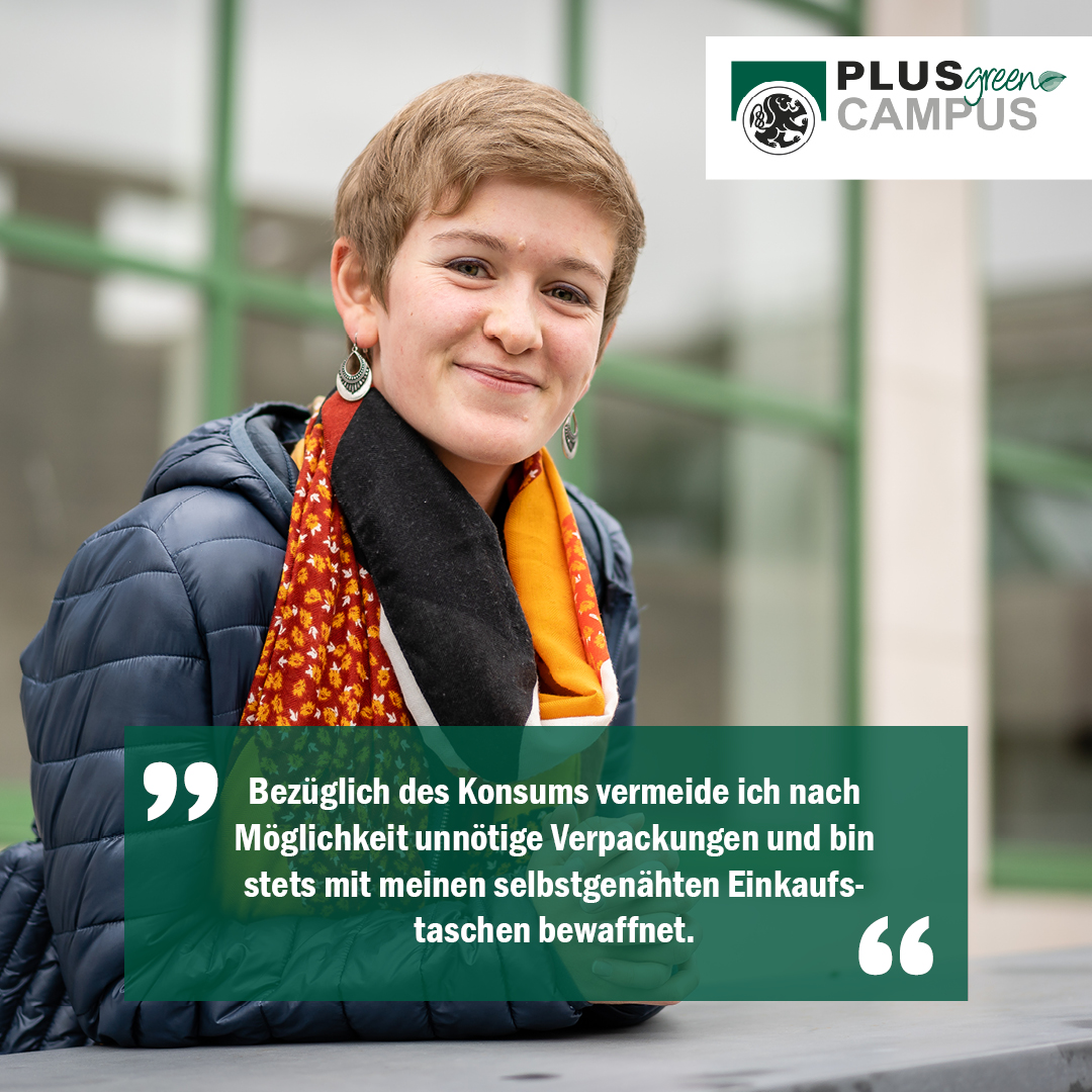 Ich finde es super, dass unsere Universität es auch als ihre Verantwortung sieht, die Studierenden nicht nur für spätere Berufe auszubilden, sondern auch ihr Bewusstsein für Umweltfreundlichkeit zu stärken. Über die ausgeschickten Newsletter des PLUS Green Campus Teams wurde ich manchmal auf neue Initiativen aufmerksam gemacht oder in der Liebe für das Radfahren bestätigt. Die Green WG Challenge fand ich auch immer sehr spannend mitzuverfolgen, dadadurch stets neue Ideen aufgezeigt wurden, wie man sogar in seiner Studenten-WG auf Nachhaltigkeit und Umweltbewusstsein achten kann.