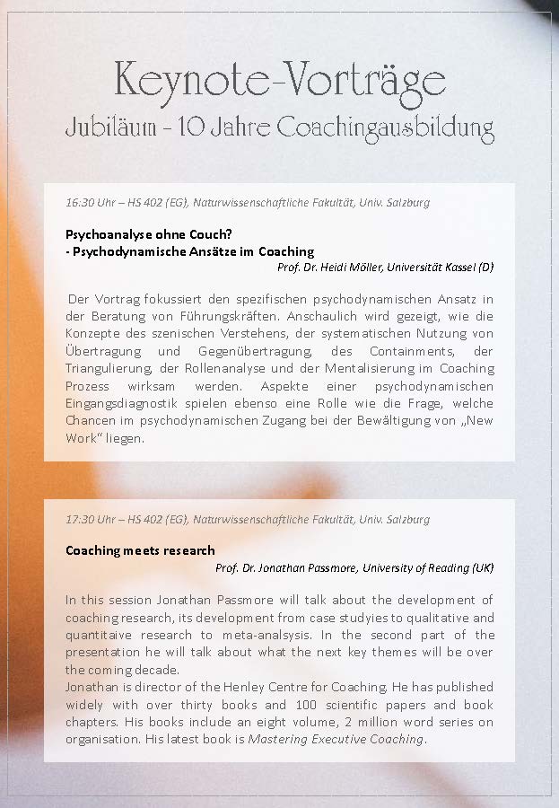 16.15 – 19 Uhr – Festprogramm – Eröffnungsrede von Univ.-Prof. Dr. Eva Jonas – Keynotesvorträge von Prof. Dr. Heidi Möller und Prof. Dr. Jonathan Passmore