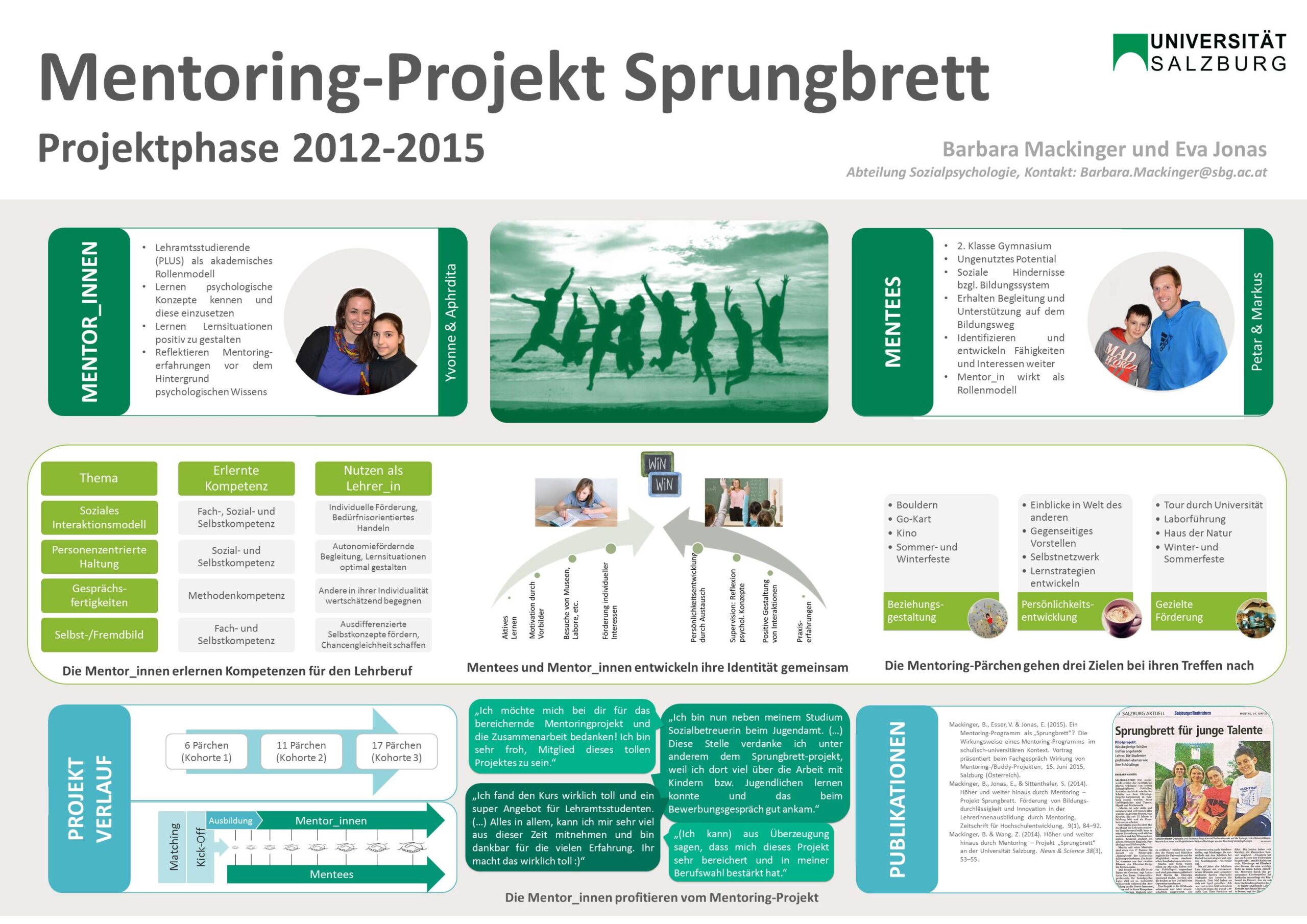 Die Grundidee des Sprungbrett-Projektes ist, dass sowohl Schüler:innen als auch Lehramtsstudierende durch eine gemeinsame Mentoringbeziehung höher und weiter hinaus kommen können! Dieses Projekt wird seit Oktober 2012 erfolgreich in Kooperation zwischen der Universität Salzburg (Abteilung Sozialpsychologie/ School of Education/Career Center) und der Insel sowie Talente-Checks durchgeführt. Je ein:e Schüler:in bekommt eine:n Lehramtsstudierende:n der Universität Salzburg (School of Education) als Mentor:in an die Seite gestellt. Die Mentoring-Paare treffen sich regelmäßig, wodurch die Schüler:innen ein wichtiges zusätzliches greifbares Rollenmodell bekommen und der Kontakt zu neuen Lernumgebungen (z.B. durch Besuche der Bibliothek, Universität, Haus der Natur) gefördert wird. Gleichzeitig profitieren die angehenden Lehrer:innen durch die Erfahrung mit den Schüler:innen, sowie durch die Ausbildung und regelmäßige Supervision (z.B. Gestaltung von positiven Lernsituationen, sowie positive Beziehungsgestaltung).